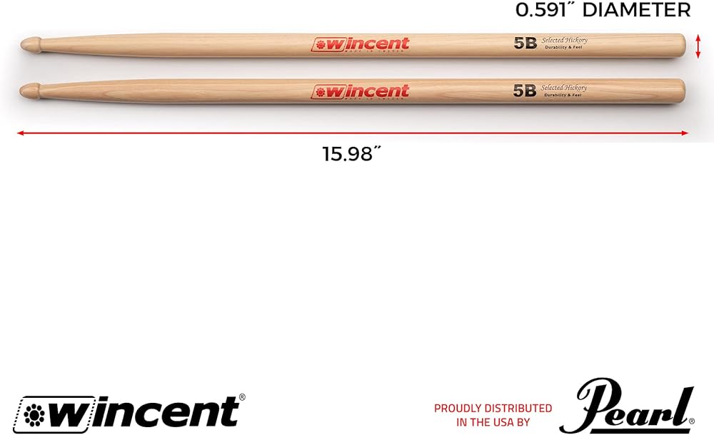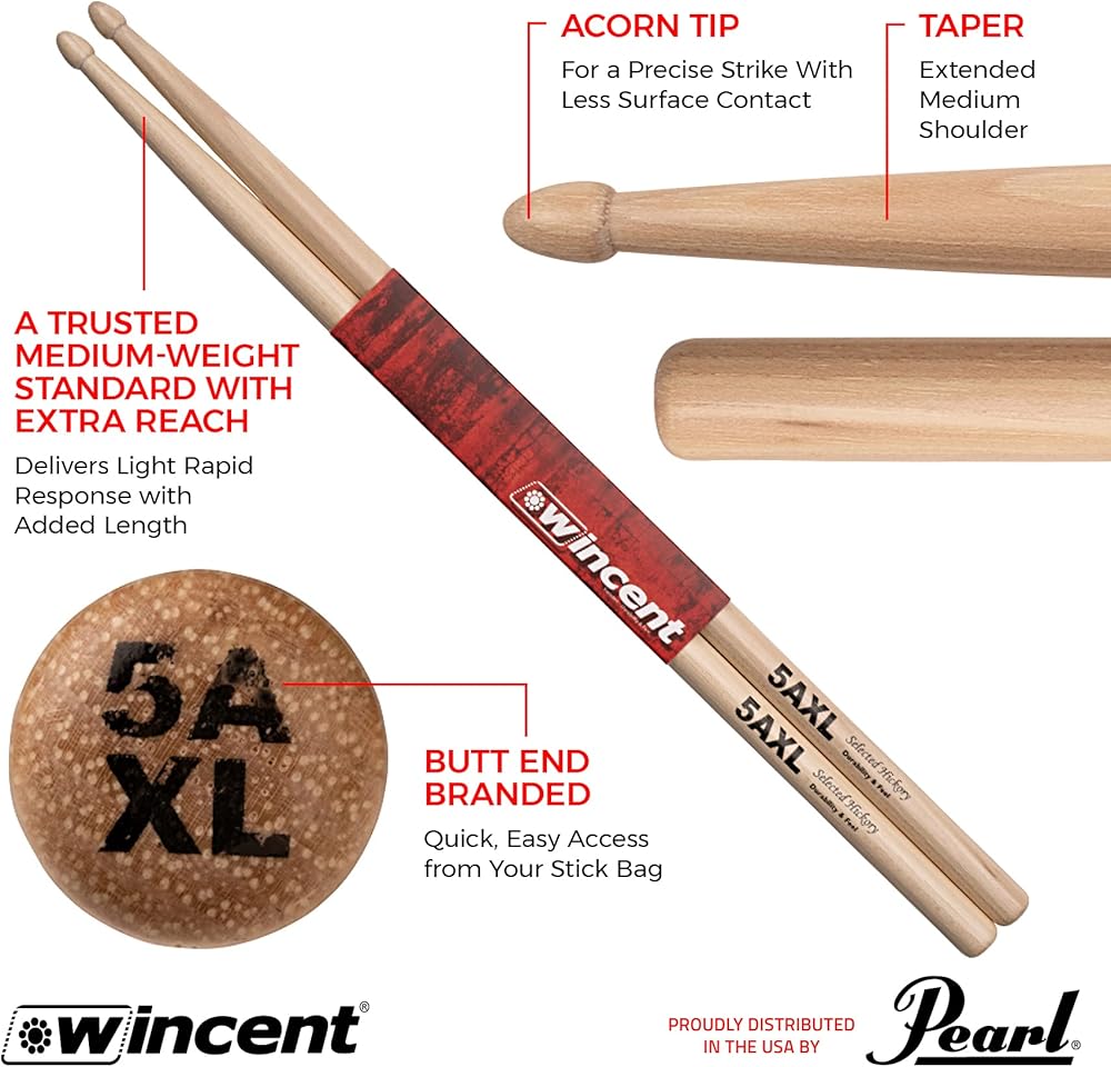 Kentucky Born, Individually Shaped and Paired in Sweden. A longer-lasting, farther-reaching spin on a player standard model, Wincent's 5AXL is a medium-light stick with an extended shaft and balanced shoulder-forward taper. Stone-ground in Sweden from the choicest cuts of Kentucky-grown American Hickory, Wincent's Unique Wax Protection (UWP) proprietary sealer is employed for better grip, increased durability and extended playing lifetime. Features beaded wood tip for defined cymbal sticking, and Butt-End Model Mark for quick access.