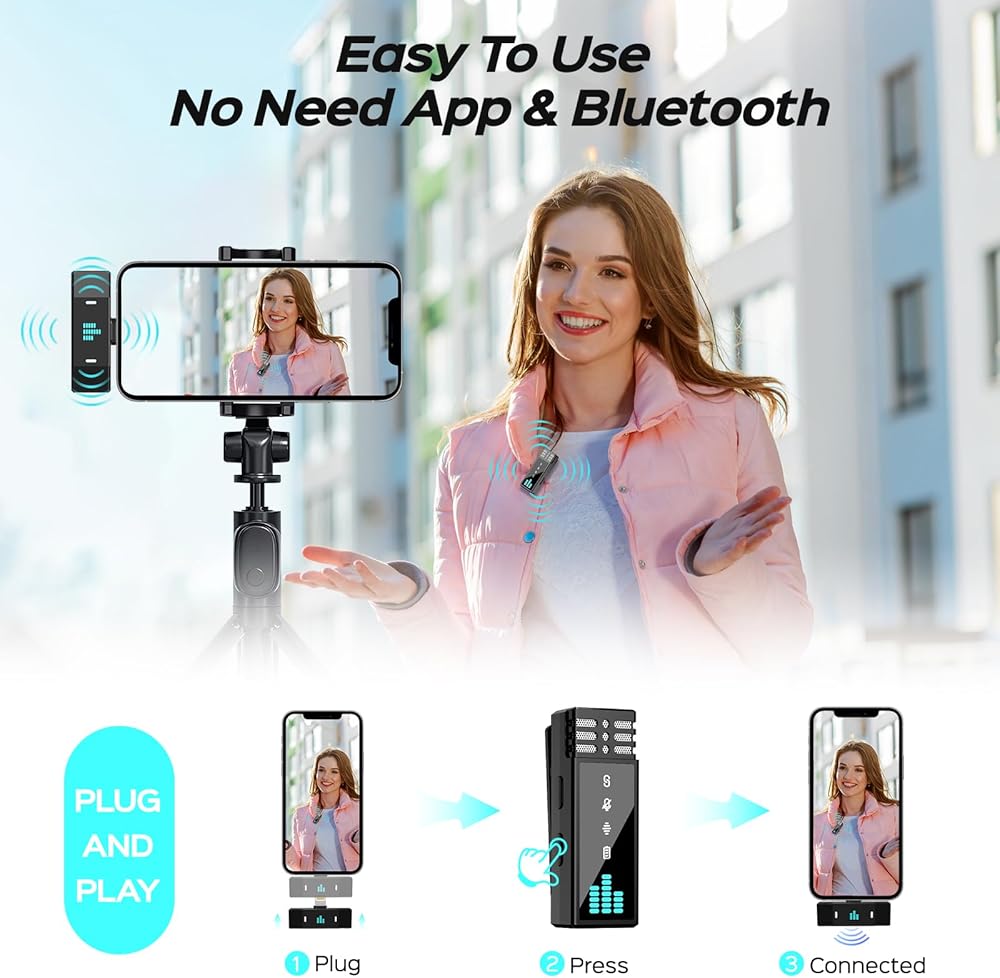 [التوصيل والتشغيل والاقتران التلقائي] تصميم الكل في واحد يجعل الميكروفون اللاسلكي سهل الحمل للغاية ويمكن الوصول إليه. لا حاجة إلى بلوتوث أو تطبيق. كل ما عليك هو توصيل جهاز الاستقبال بجهازك، وتشغيل الميكروفون اللاسلكي، وسيبدأ الميكروفون اللاسلكي في العمل من أجلك قريبًا. (انتبه، تم تصميم الميكروفون اللاسلكي الخاص بنا حصريًا لأجهزة iPhone وiPad)