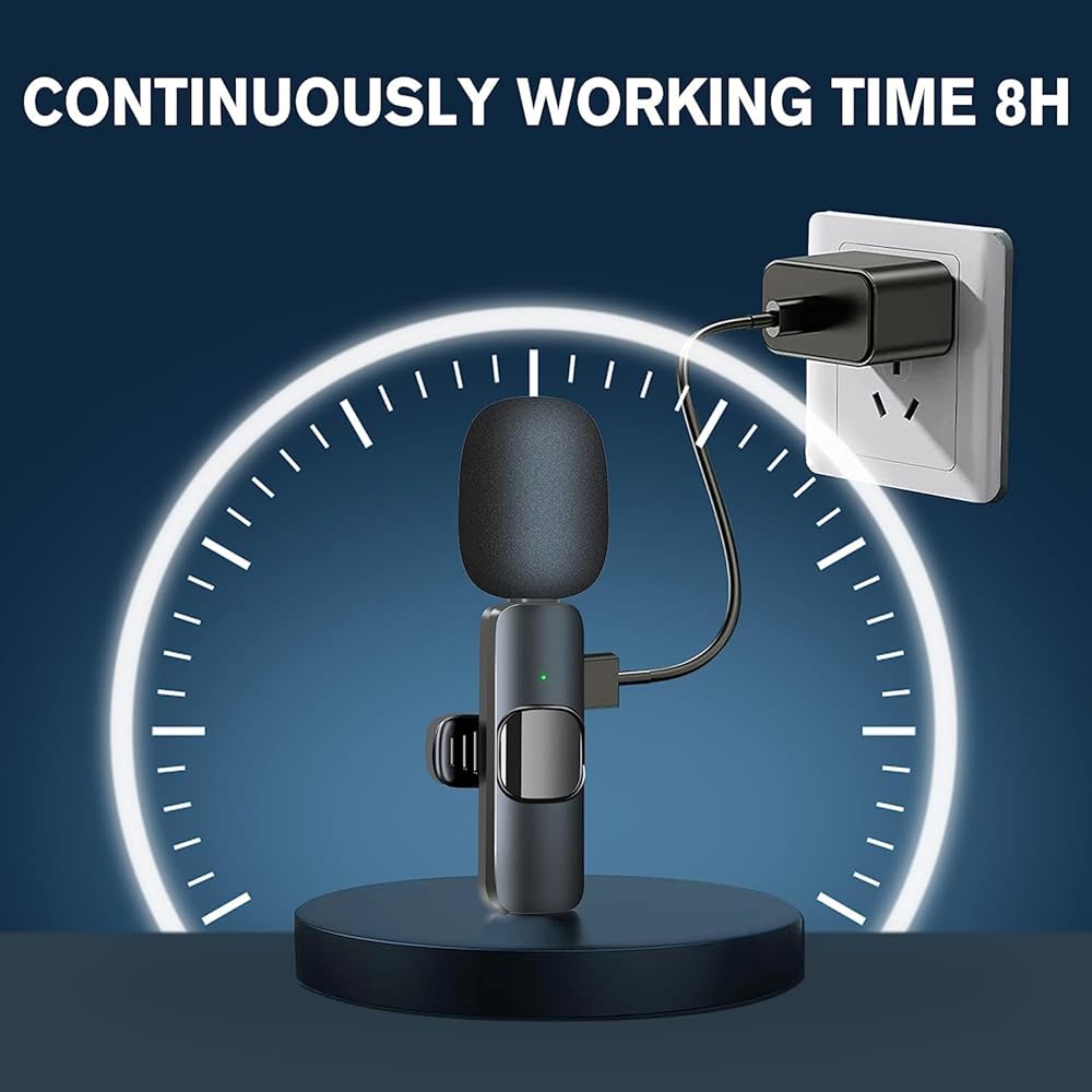 【Easy to use】Our professional wireless lavalier microphone requires no fussy setup. There's no need for an adapter, Bluetooth, or App. Just plug the receiver into your device and turn on the portable microphone, and the two parts will pair automatically. When the microphone's blue light stays on, it means the microphone is working properly.Built-in large capacity rechargeable battery and low power chip, this wireless lavalier microphone provide more than 8 hours of battery life and only 1 hours to get fully charged.2 packs of mic allow two people to get involved in a video recording together, providing efficiency and convenience for a team worker.