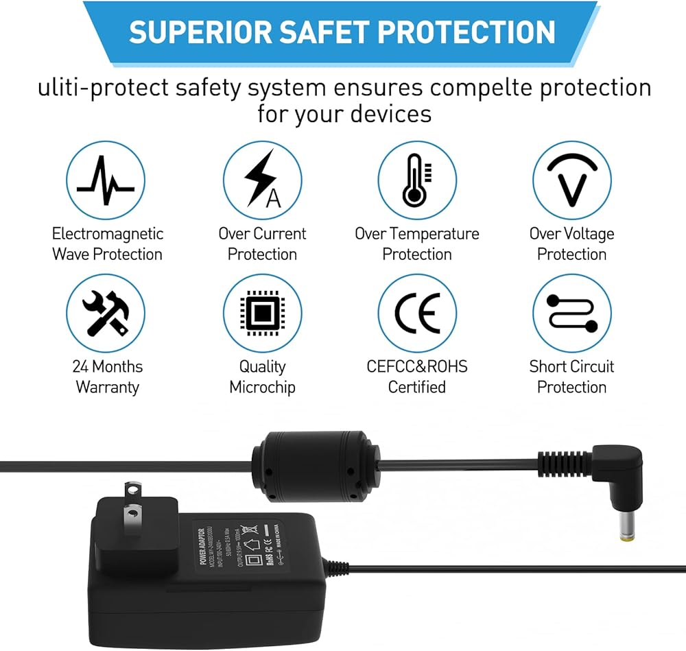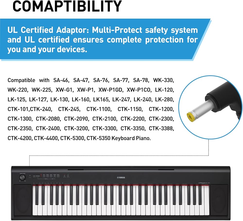 9.5V AC/DC Adapter for Casio Piano Keyboard: UL Listed Power Supply Charger for Casio Keyboard Power Cord AD-5 AD-5MU AD-5MR SA-46 WK-110 WK-220 LK-43 LK-100 LK-120 CTK-496 (8.2 Ft Long Cord)