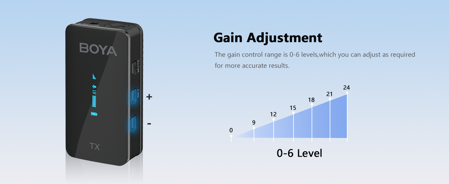 【MONO/STEREO MODE & GAIN ADJUSTMENT】 Microphones provides mono/stereo switching, 6 levels (0-24db) adjustable gain range and mute function.Built-in omnidirectional mic and external lavalier mic two input modes, which can be flexibly selected according to your recording needs