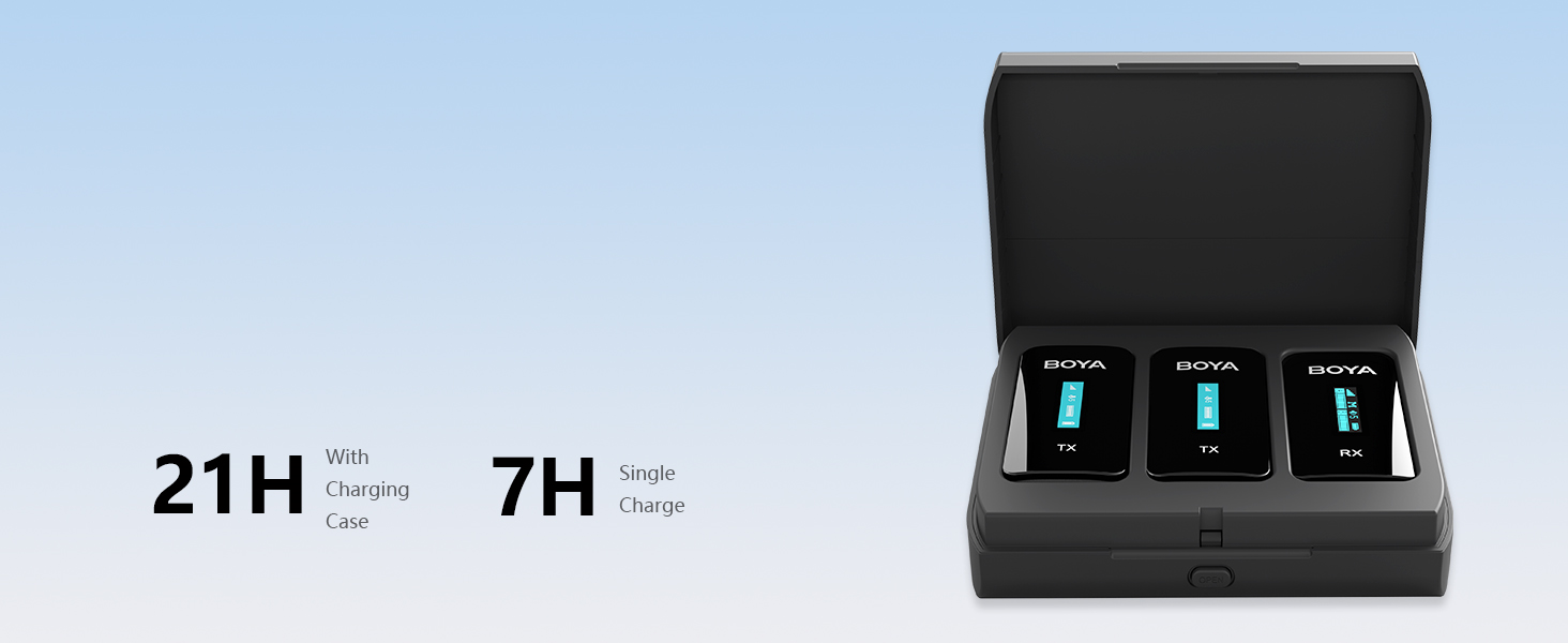 【POWERFUL CHARGING CASE】The charging case is lightweight and compact, easy to carry outdoors, and can fully charge 2 transmitters and receivers at the same time. The charging case can be fully charged in 4.5 hours, and the power indicator light allows you to easily check the battery capacity and charging status.