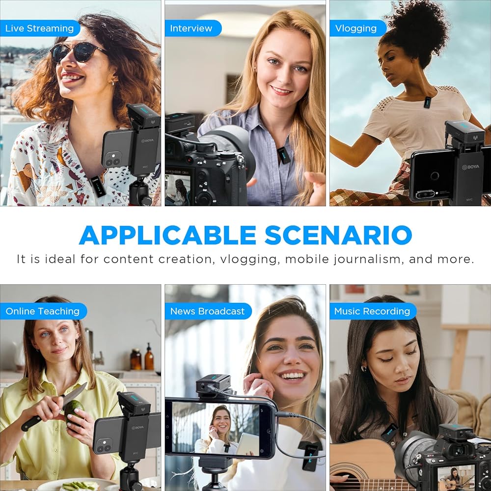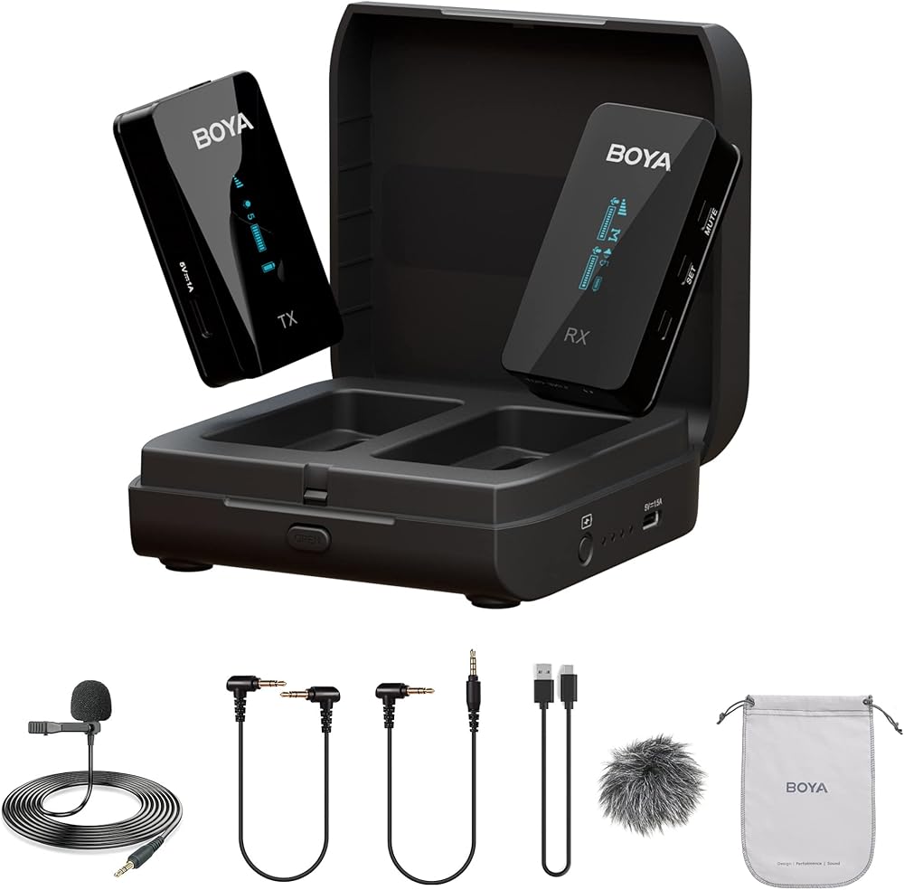 【2.4GHz DUAL CHANNEL WIRELESS MICROPHONE】The BOYA BY-XM6-K2, a 2.4GHz dual channel wireless microphone system, consists of two transmitter, one receiver, as well as a charging case. It's a perfect sound capturing, delivering solution for two-person vlog, YouTube video, live streaming, interview, recording, etc.