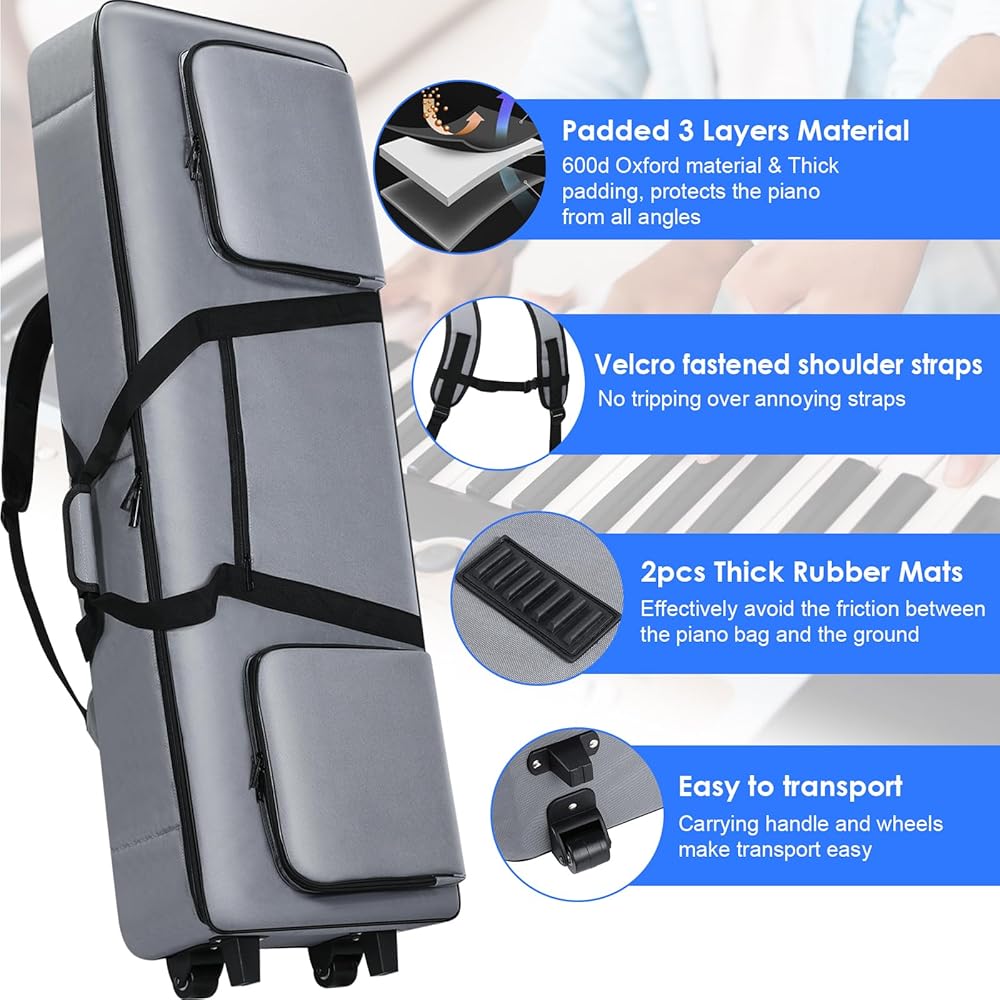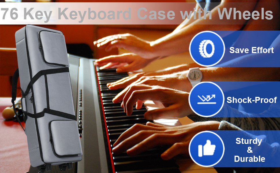 【3 Ways to Carry Keyboard】With a firm soft handle, you can carry your 76 key keyboard bag with one hand, and will not be uncomfortable for long-term use. 2 adjustable ergonomic padded shoulder straps allows you to carry the piano bag as backpack, freeing your hands to do other things. Equipped with 2 high quality wheels, you can use it as a suitcase to carry your 76 key keyboard easily.