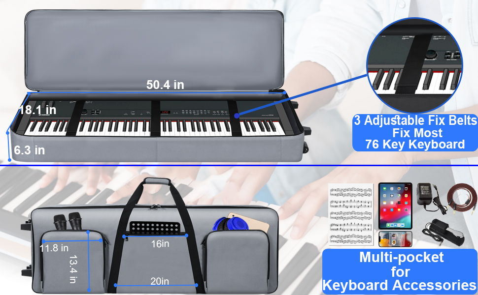 【Full Protection for 76 Key Keyboard】There are thick padded covered in 76 keyboard case, which protect your keyboard from bumps, scratches or other damages. 3 interior adjustable security belts to tight your keyboard, avoid damage by shaking during transport practice, ensure your keyboard stays safe.