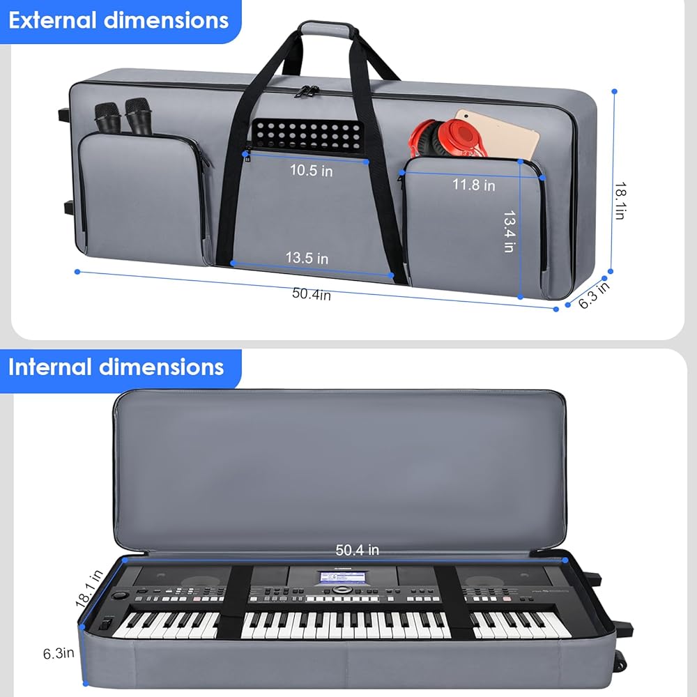 【76 Key Keyboard Case with Wheels】The 76 key keyboard case has internal dimensions of 50.4"x18.1"x6.3". Please check the size of your keyboard before purchasing. The portable 76 key keyboard case comes with wheels and handles for easy portability. You can use it as a suitcase to carry your keyboard, save your energy and focus more on your playing. Keyboard case with wheels is compatible with Yamaha, Kcasio, Roland, Alesis, (NOT FOR ALL 76-Key Keyboard OF THESE BRAND).
