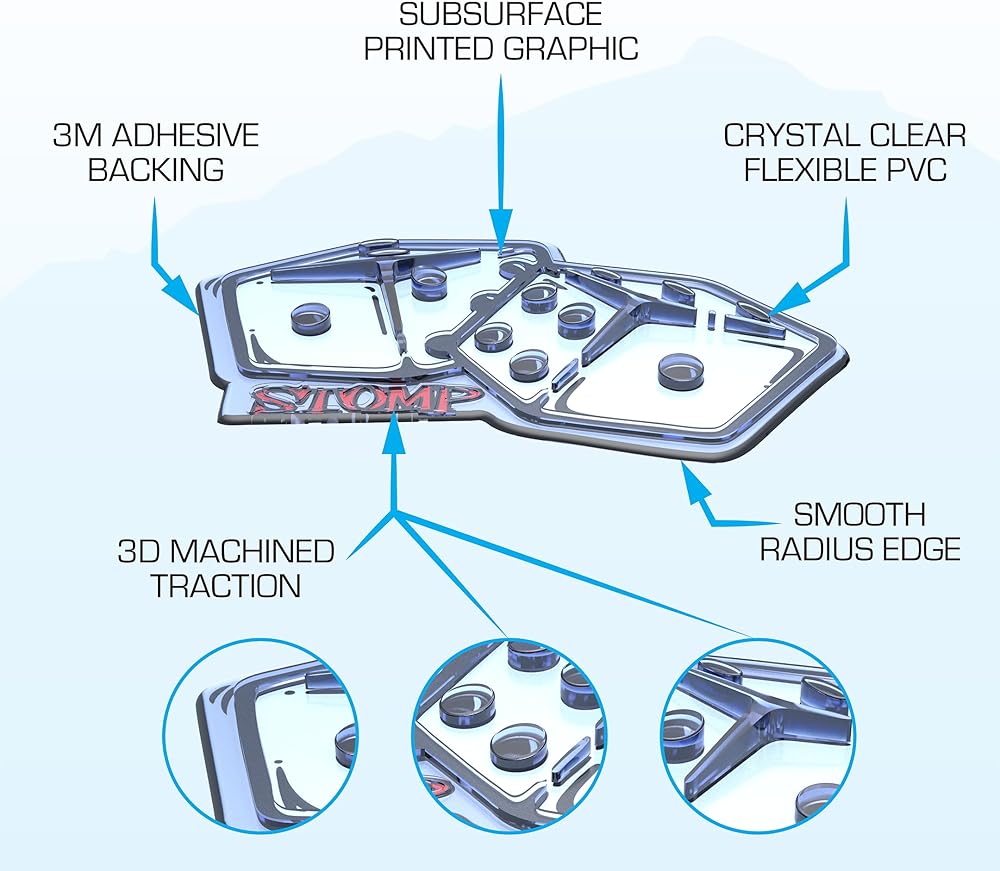 3D DESIGN & FUNCTION: Stompgrip's Stomp Pads are 3D CAD designed, and injection molded in unique shapes with multiple traction profiles available to choose from which provide varying levels of grip and protection. Stompgrip Stomp Pads have a unique, rounded-edge design to prevent peeling off snowboards under extreme use versus being die cut with rough edges that can catch or snag on boots.