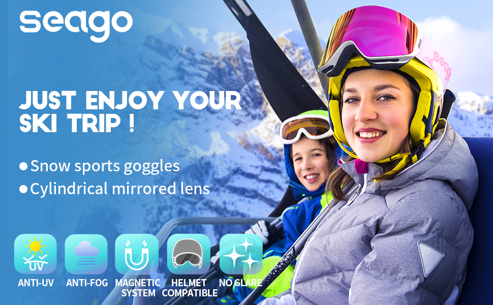 🎿【OPTIMIZED PERFORMANCE SKI GOGGLES】 Seago mirrored magnet ski snowboard goggles have a medium fit for most women men & youth to block harmful UV light and enhance contrast on the slope. Designed for snowboarding and skiing, our snow goggles is the perfect snow gear for cold weather activities, such as skating, ice climbing, ski racing, skydiving, snowmobiling, cross-country skiing and other winter snow activities.