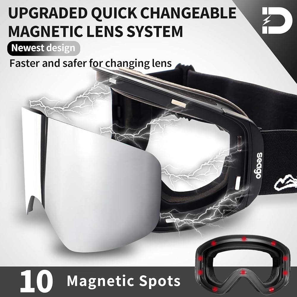 🎿【Quick & Secure Changing Lens System】Unlike the old magnet ski goggles in the market, Seago ski goggle designed with 2022 newest design-10 rare earth magnets spots- can change lenses in seconds, providing a faster, easier, and more secure way to adapt instantly to changing light conditions. The10 tight and strong magnets spots improve the fit and stability of the lens, ensuring that the lens can be replaced quickly and safely in any circumstances.