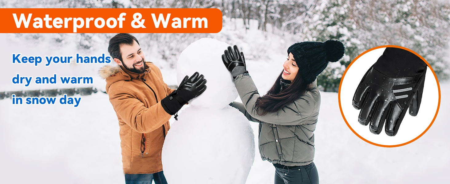【Waterproof Design】Mens women heated gloves is made of different material, include weather resistant nylon, waterproof film. And the palm and finger area of the heating gloves are premium leather, non-slip, wear-resistant. So can use it in rainy or snow days, waterproof and wind resistant. Bringing comfort and warmth to hands in the cold winter.