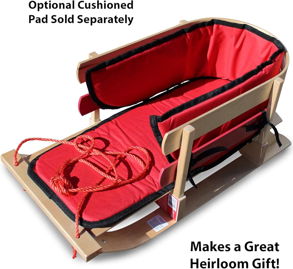 This adorable wooden baby sleigh is a great way to enjoy the winter with your young child. Handcrafted from Northern hard Rock Maple wood with steam bent backrest and runners, wooden skis are protected by steel runners underneath for crossing streets and patchy snow. Elevated riding position keeps your child dry, while this baby sled's high double-slat backrest is great for kids who need extra support sitting. Wide base keeps this toddler sled stable for a safe ride. Comes fully assembled, and ready to use. Includes rope for towing This baby pull sled. Heirloom quality makes a perfect gift for Grand children or friends. For matching fitted padding to keep cold air from circulating around your child's bottom and back, search for “Flexible Flyer pad for baby pull sleigh”.
