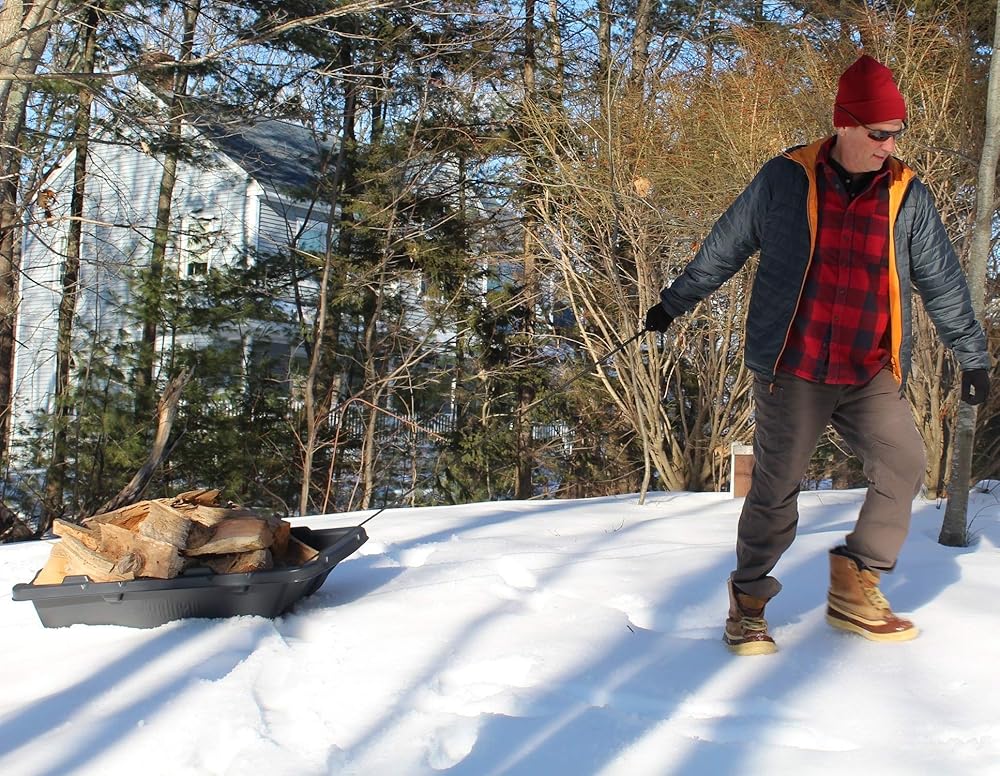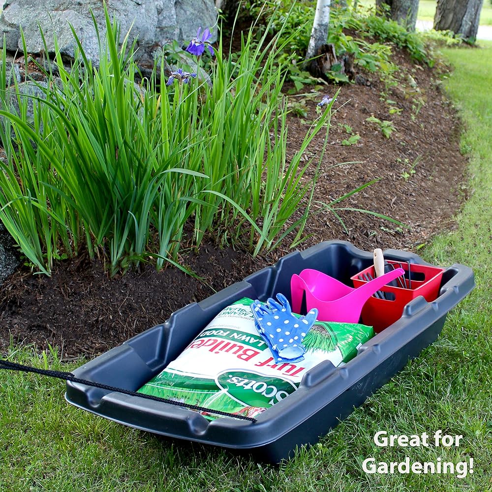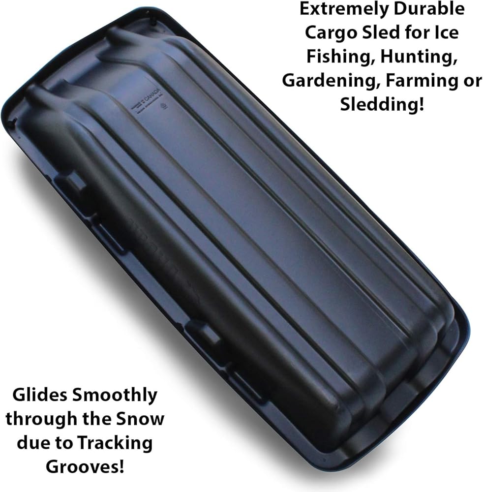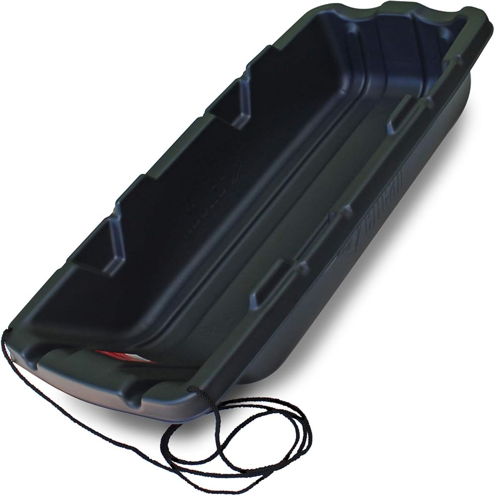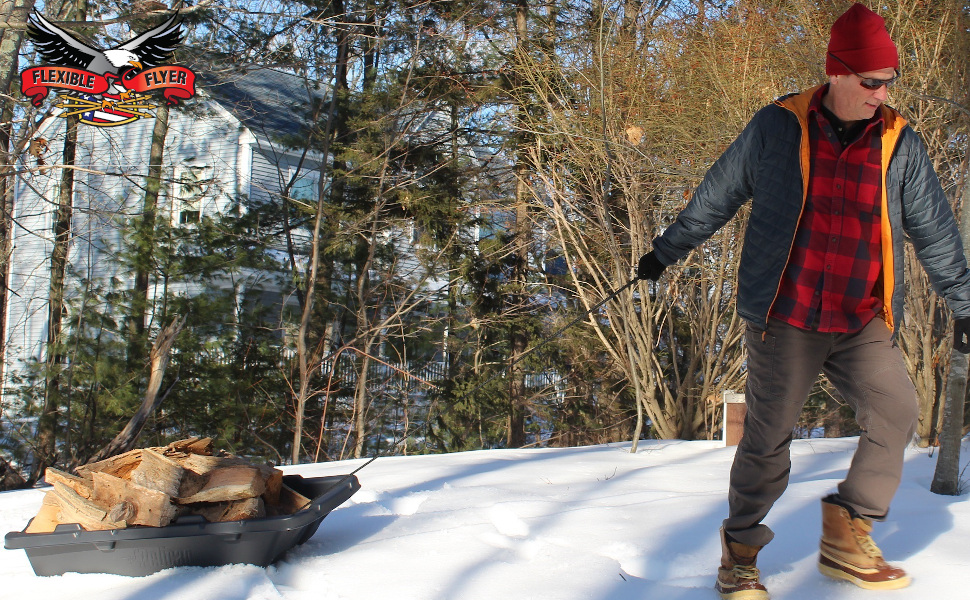 Flexible Flyers' large utility sled is a heavy-duty sled designed to haul big heavy loads over snow, ice, mud and more. Boasts a large dimensional footprint and huge capacity that lets you take on big winter project. Holds four 5-gallon buckets, or 1/16 cord of firewood, or a Christmas tree, or your fish finder, folding chair, auger, tackle and shelter. Made of tough, one-piece, high-density polyethylene (HDPE), with reinforced outer lip for optimum durability. Easy to pull by hand, snowmobile or ATV. This heavy duty cargo sled has nearly limitless potential uses. Use as a work sled, ice fishing sled, deer sled, elk sled, firewood sled, or Garden sled. Includes a heavy-duty tow rope. For safety, we don't recommend towing with advs., 4-wheelers or snow machines with people in the sled.