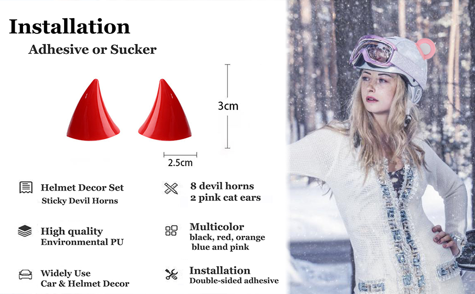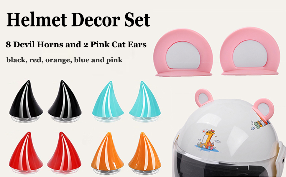 Cute Helmet Horns Set - you will get 4 pairs devil horns and 1 pairs ski helmet pink cat ears. Cute Helmet Horns Set also come with 10 pieces of adhesive, 8 pieces of suction cups. The devil horns is black, red, orange and blue, which is evil enough for your Halloween helmet decoration