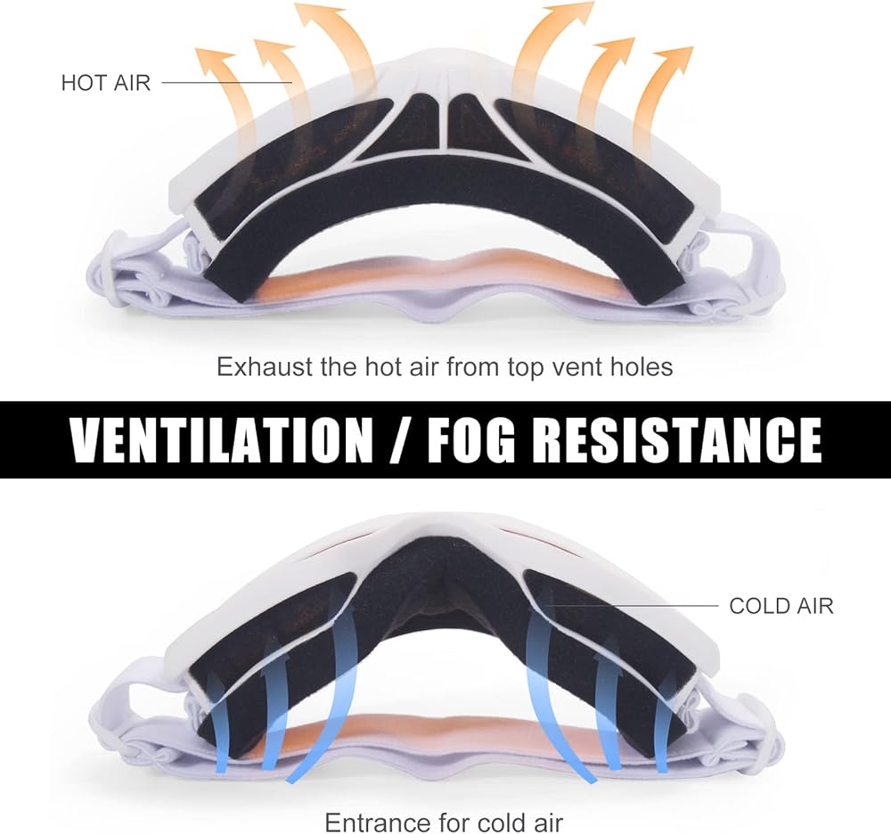 【PROFESSIONAL VENTILATION】Designed to reduce fogging and optimizes the flowing air over the inside of the lens. ski goggles provide smooth air-flow system which brings fresh air and exhaust moisture quickly and effectively.
