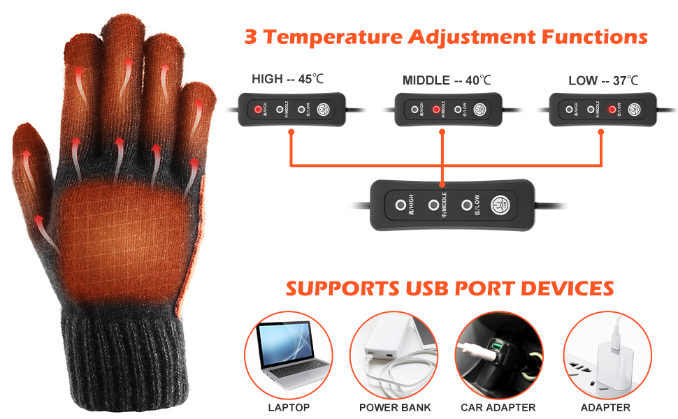 【USB 5V Power】- Powered by USB 5V, safety and easy to operate, just put on knitting heating mittens, plug it into a USB port with a 5V power supply, turn on the power, adjust the temperature, and wait for the heating pad to heat up. Fashionable and youthful design guarantees warmth and grace, which is deeply loved by the public. When not in use, unplug the power supply to avoid accidents caused by long-term heating.