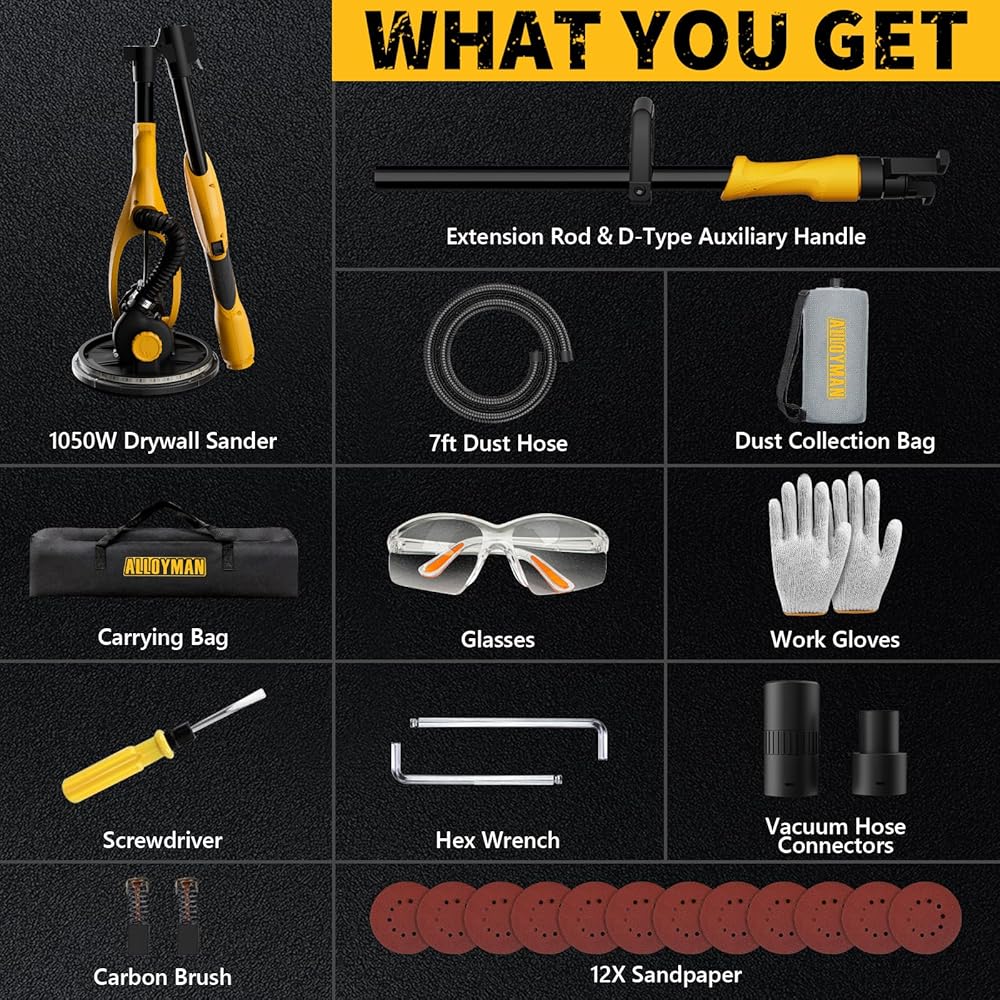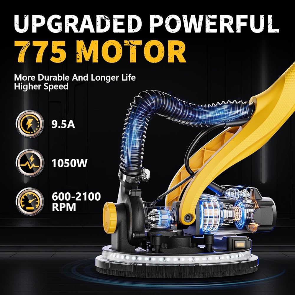 Drywall Sander, 1050W Electric Drywall Sander with Vacuum Dust Collection, 2100RPM Wall Sander with 7 Variable Speed, Foldable & Extendable Handle, Double-Deck LED Light, Dust Bag and Hose