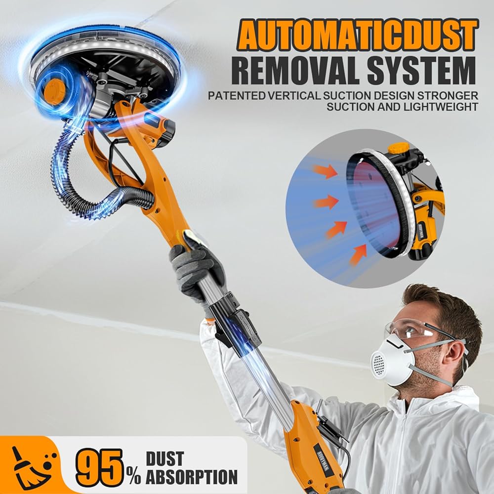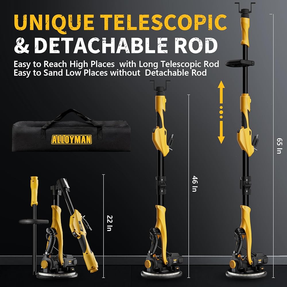 【Retractable Handle】Electric drywall sander with a retractable handle and an auxiliary handle that extend from 1.1m to 1.65m, allowing you to easily reach corners and high ceilings without a ladder. And the auxiliary handle allows you to better control the drywall sander and work better.