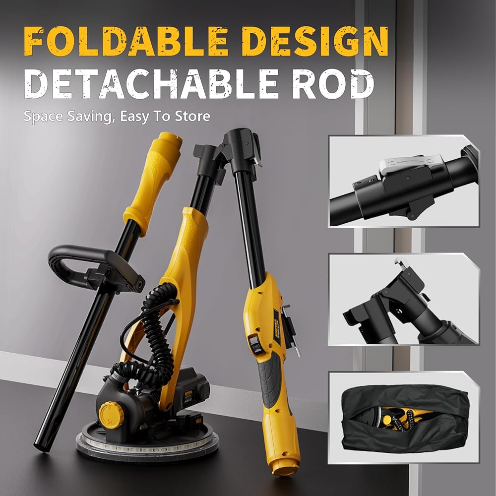 【FOLDABLE DESIGNS】Electric drywall sander can fold the body to reduce the storage space, also with a storage bag for easy storage and portability. In addition, the dust collection hose can also be connected to your own vacuum cleaner for better dust collection.