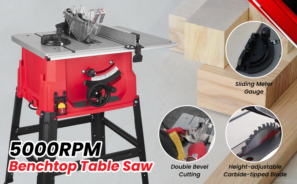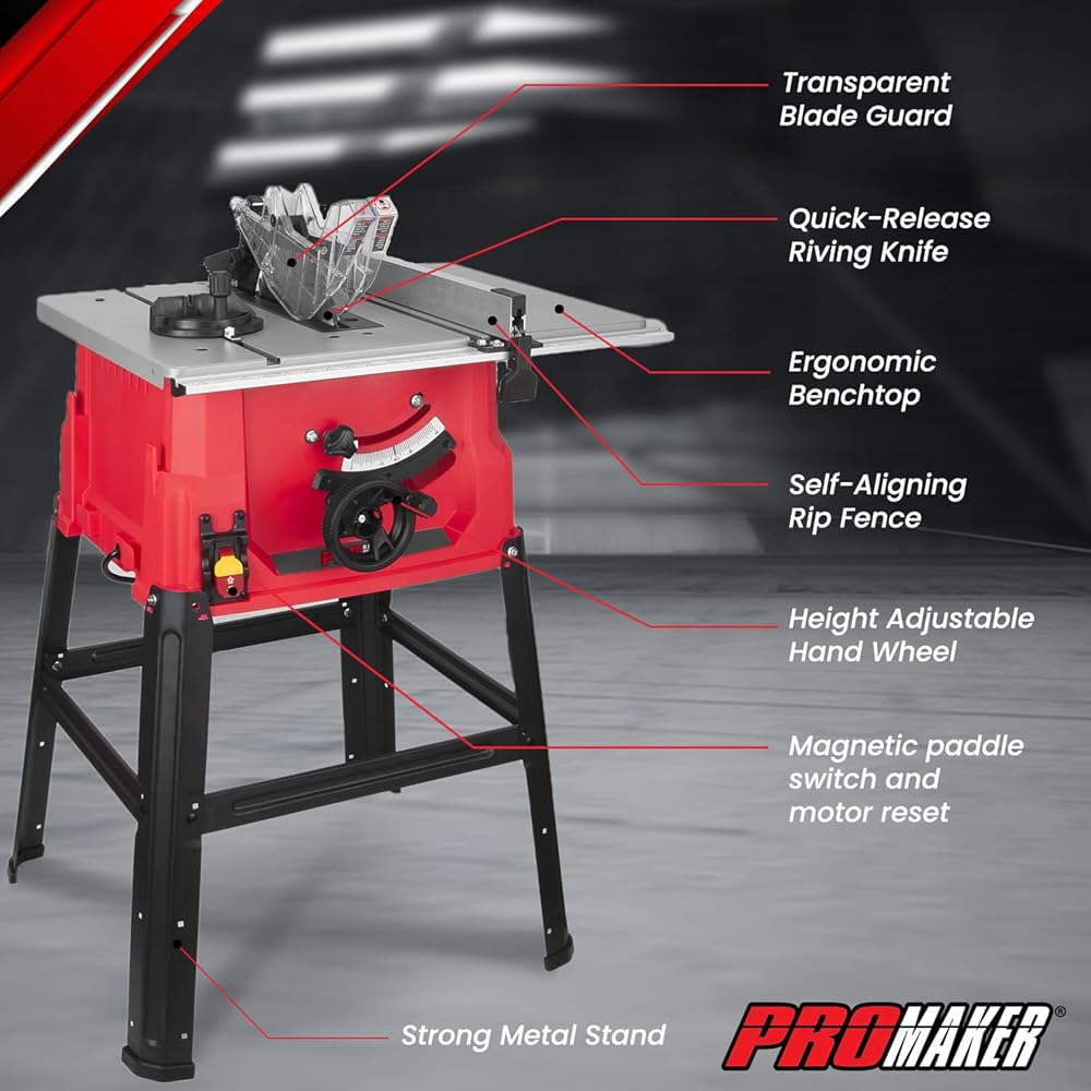 PROMAKER Table Saw, 10-inch 15.5-Amp 5000RPM 1800W, Benchtop Table Saw, from 0-45º up to 0º-90º Bevel cut. Table saw 10 inch with metal stand for woodworking including a Saw Blade. PRO-SB1800