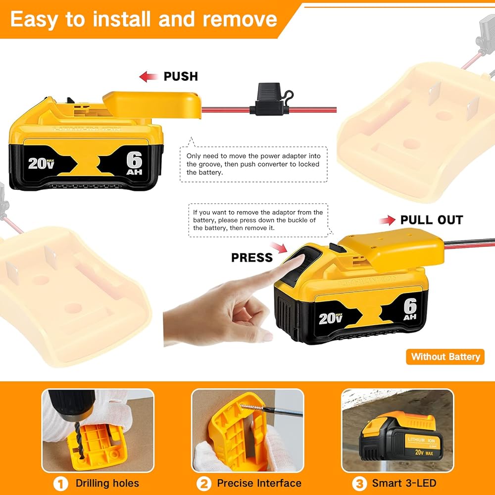 💝EASY TO DIY:The 5-in-1 power wheels adapter kit for Dewalt 20V/60V MAX battery DCB200 DCB201 DCB207 DCB205-2 DCB206,includes excellent wiring terminals,making it convenient to connect your device's power cord to the adapter wire.This allows you to use for Dewalt tool battery holder wall mount to power other devices,ensuring efficient completion of various tasks.It is also compact and lightweight for easy carrying and storage,making your toolbox more organized.