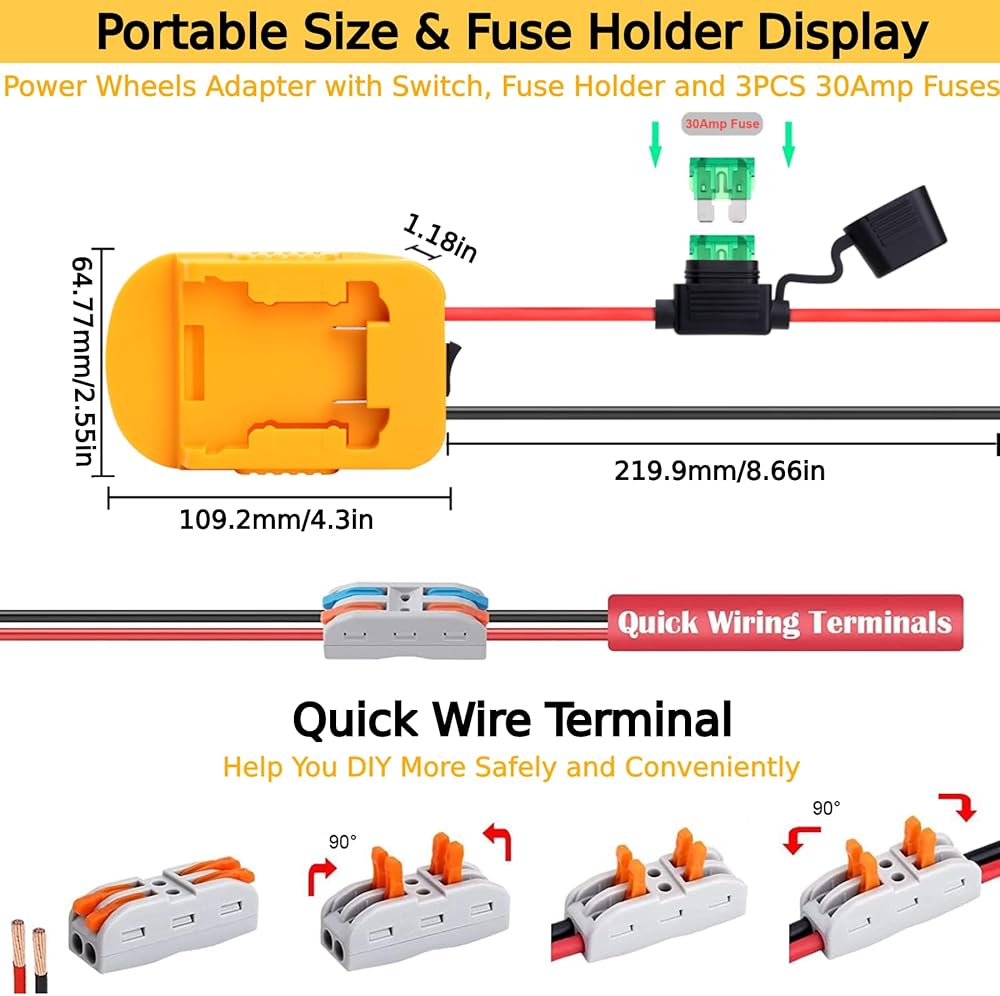 【DIY OPERATION】The power wheels adapter equipped 10 inches of 12AWG gauge wire, which can withstand more current and more durable than 12AWG gauge. Maximum permissible current 20A, you can use it to upgrade your power wheels, toys, robotics DIY and high power application, etc. Small and portable, allowing your kids to enjoy endless power wheel fun.