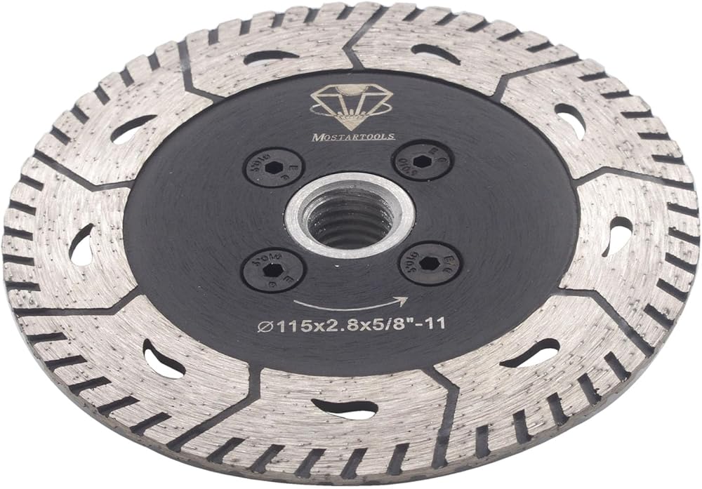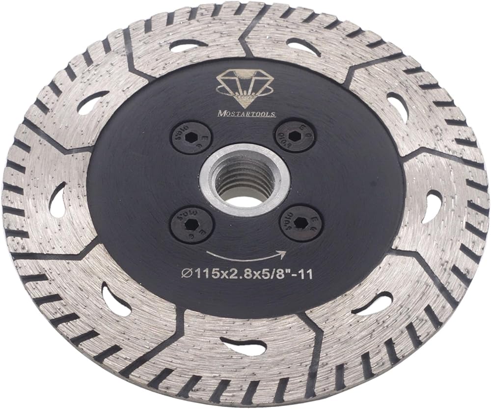 MOSTARTOOLS Two-in-One diamond cutting blade is specifically designed for both cutting and grinding applications.It is an excellent choice for all building materials and masonry construction products.This diamond multipurpose cutting and grinding disc is with grade A diamond crystal inside its turbo shape segment.It brings longer life and higher efficiency.The unique 2-in-1 turbo rim design allows the cutting & grinding applications on one diamond blade.It is suitable for granite, concrete,stone, masonry, bricks, pavers, blocks cutting,grinding,sharpening,carving,leveling and coating removal.Our diamond blade can be used for both dry and wet cutting.The 5/8 in.-11 female adaptor can be fit on angle grinder,skill saw, and handsaw.