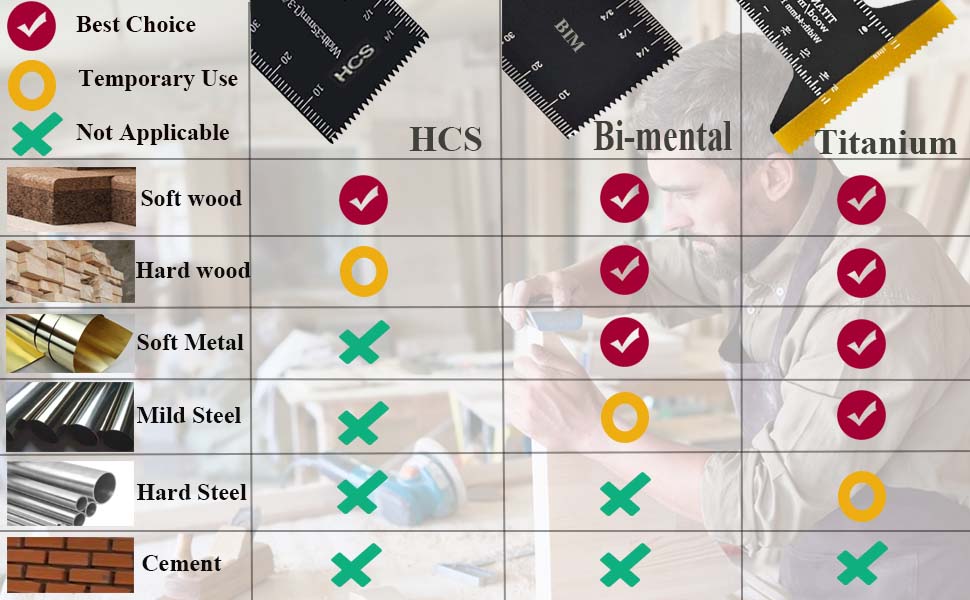 【Superior Value Kit】Package includes 3 different types Titanium oscillating multitool blades: 10Pcs 1-3/8", 10Pcs 1-3/4", and 2Pcs 3-1/2". Various types of multitool blades meet your various cutting needs.