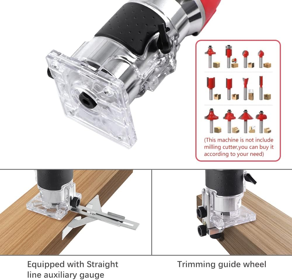 【What You Will Get】-- Package includes: 1x Electric wood router,1x Straight line auxiliary guage,1x Trimming guide wheel,2x Small wrenches,2x Replacement carbon brushes,1x user manual. We provide warm solution for any questions of the product or operation