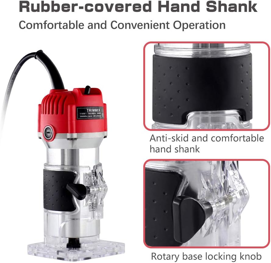 【High Accuracy & Ergonomic】-- With transparent base,you can clearly observe the wood processing conditions while operating the router tool. Built-in scale helps for more accurate wood trimming. Adopts ergonomic rubber-covered handle,provides an insulated and comfortable grip