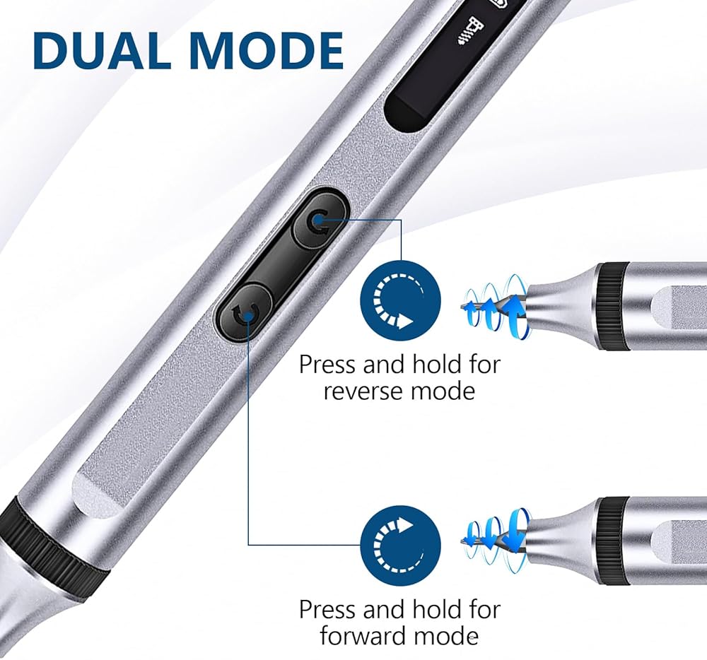Dual Working Modes: Our electric screwdriver is built with a durable aluminum alloy surface and offers 170r/min rotation speed. It supports both manual mode (torque of 3.5N.m) and electrical mode (torque of 0.3N.m) for maximum efficiency. The forward and reverse button of this cordless screwdriver allows you to tighten or loosen screw bits with just a single press.