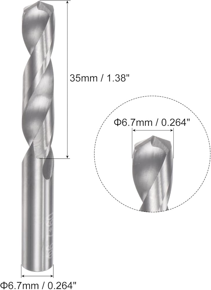 Twist Drill Bits: Drilling Diameter: 6.3mm / 0.248"; Flute Length: 35mm / 1.38"; Overall Length: 60mm / 2.36"; Cutting Hardness (Max.): HRC45. Spiral chip space design for fast and clean chip removal. Sharp cutting edge provides smooth cutting and no glitches.