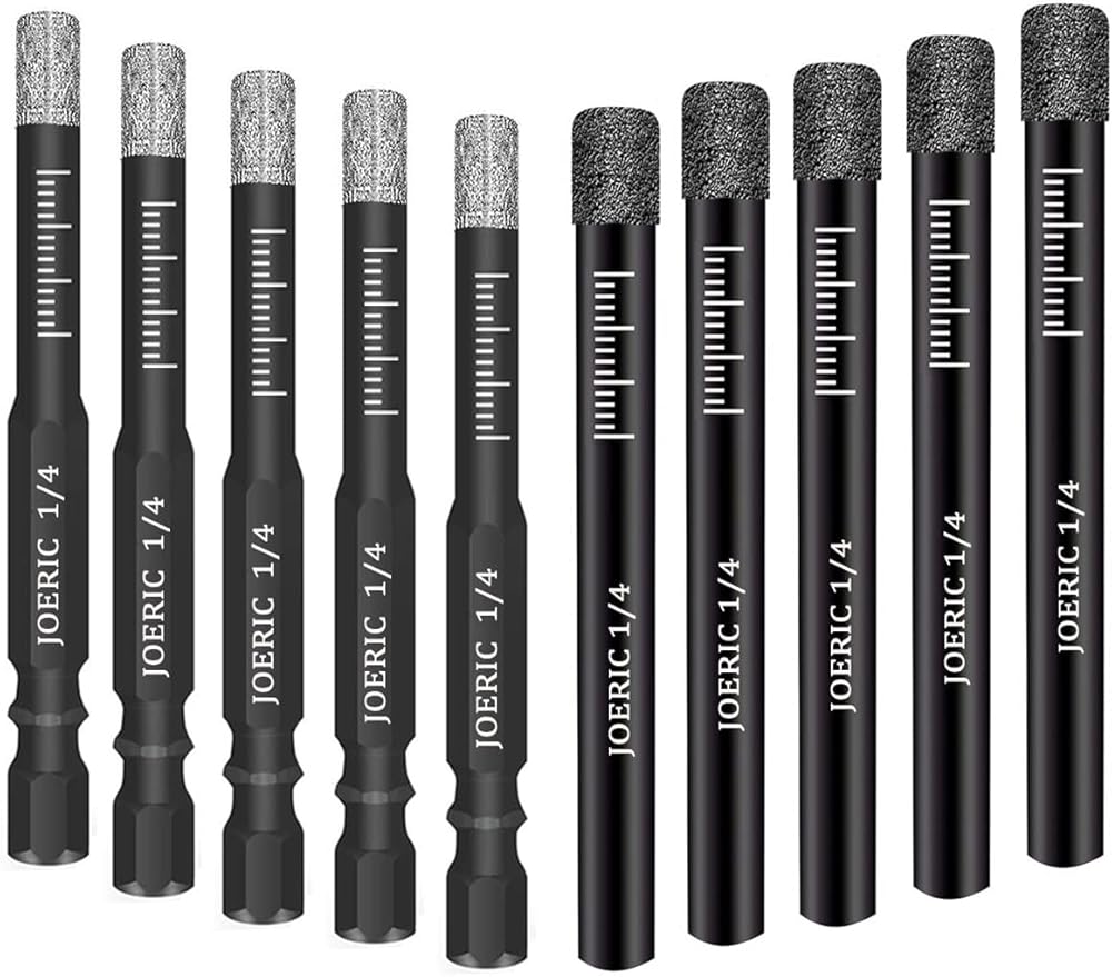 JOERIC Black 1/4" Dry Diamond Drill Bits Set, 10 PCS 6mm Diamond Core Drill Bit with Storage Bottle for Granite Marble Tile Ceramic Stone Glass (Not for Wood), Including hex Shank and Round Shank
