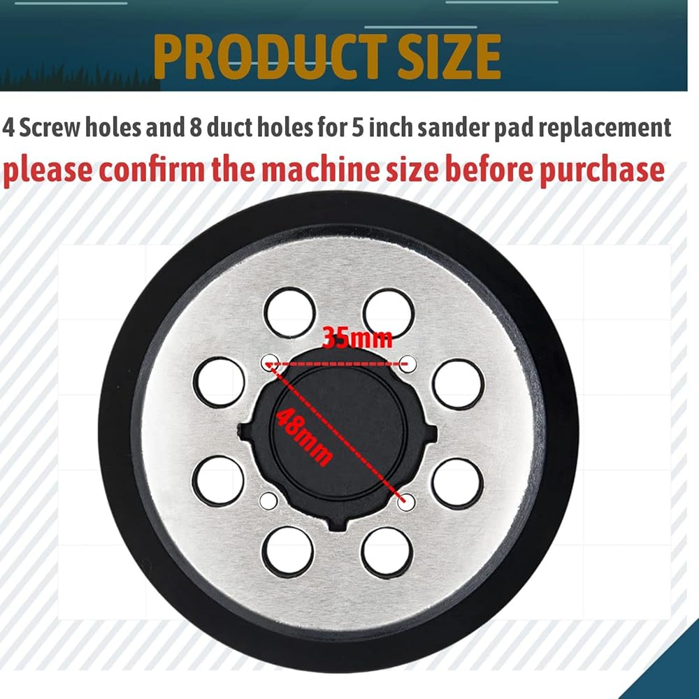 SPECIFICATION SIZE:5 inch hook and loop sanding pad has 4 screw holes(screws not included) and 8 dust holes, Center distance of non-adjacent screw holes is 1.97 inches/50 mm, Center distance of adjacent screw holes is 1.38 inches/35 mm, please confirm your machine size before purchasing