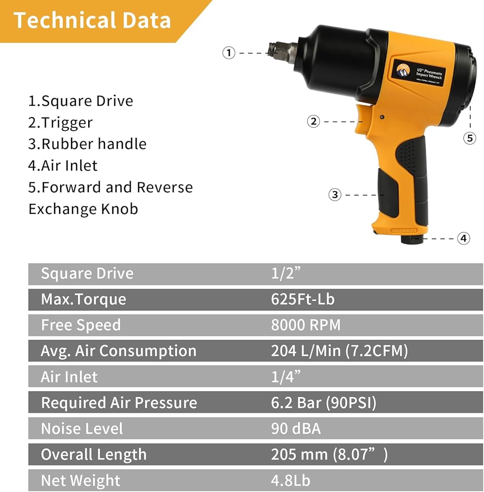 [WIDE APPLICATION] This 1/2-Inch air impact wrench is powerful enough to loosen tough bolts easily, it is designed for mechanical repairs, tire shop, suspension, frame, and other heavy-duty automobile work.