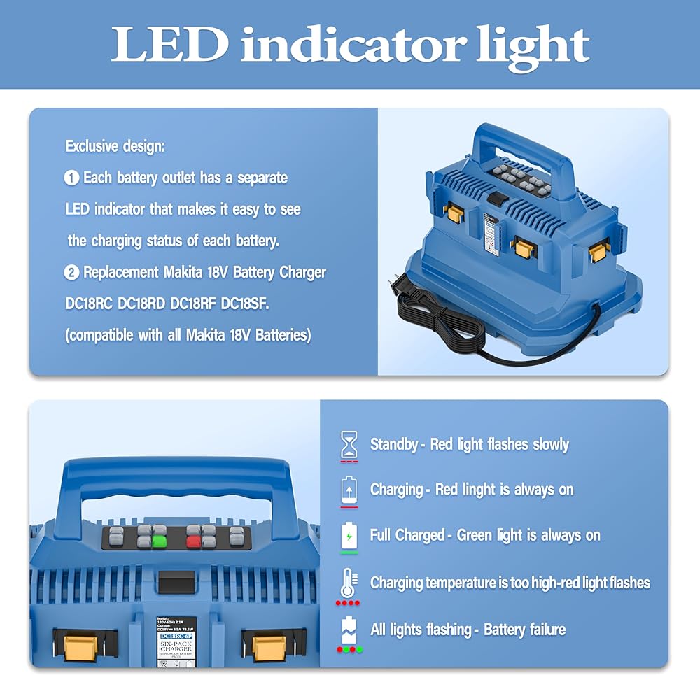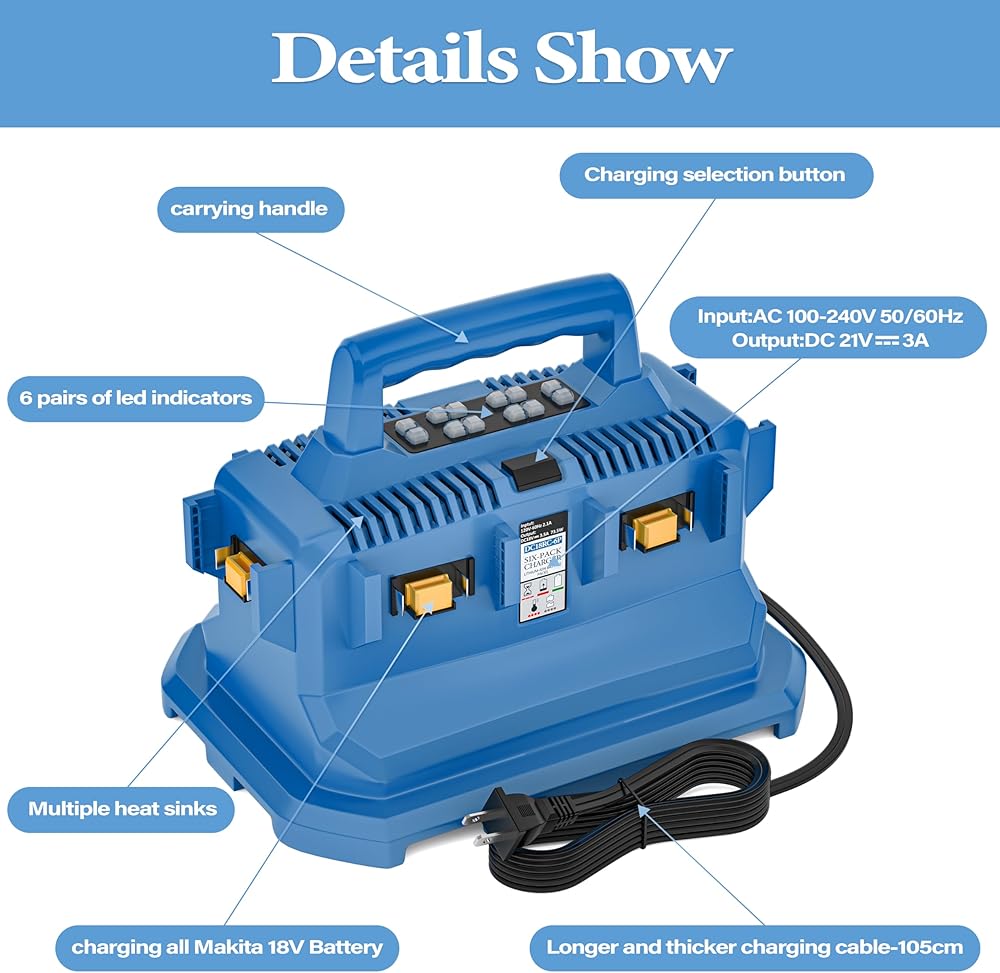 ⭐【DMMNS DC18RC-6Ports Rapid Charger】Replacement for the Makita battery charger is a 6-in-1 charging station. It has an input voltage of AC100V-240V 50/60Hz and an output voltage of DC21V 3A. Each charging port is equipped with an LED indicator, allowing you to easily monitor the battery charging status. This charger serves as an excellent alternative to the Makita fast chargers such as DC18RC and DC18RD. It charges the batteries at a satisfactory speed and performs just as well as the OEM model.