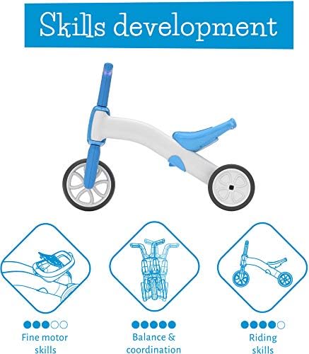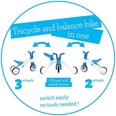 Chillafish Bunzi 2-in-1 gradual balance bike and tricycle is uniquely designed to help teach your child balance at his own pace in a fun way. Your child learns to balance step by step on 3 wheels and when it's ready, on 2 wheels. Made of high-quality ABS material, the frame can switch between a 3-wheel mode to a 2-wheel mode in just a few seconds; no tools required. The back wheels in 3-wheel mode still offer more stability, but are purposely close to each other, hence less stable than a traditional tricycle or 4-wheel ride-on, so your child feels in control of his own balance. The seat grows with your child (8.7 inch / 22 cm in 3-wheel mode to 9.8 inch / 25 cm in 2-wheel mode). Only in this way the new skills of your son or daughter can be better supported, just until he or she has mastered balance and is ready for a bigger balance bike like BMXie2 or Charlie. The silent anti-skid synthetic rubber tires are non-marking; so no worries when your toddler wants to ride inside the house. But the material of the tires is also strong enough to be used outside and to survive the wildest outdoor treks. Bunzi is made of a very lightweight high-quality ABS material (4,16 pound / 1,8 kg), which makes it easy to carry around thanks to the handgrip built into the back of the seat. You can easily bring the Bunzi on all your child's trips and adventures. Your child can bring along a toy or snack for the ride in the hidden storage box. Your son or daughter will love it and it's at the same time also very useful to train the fine motor skills of your lovely toddler. With cute bunny-style handlebars, an intuitive form that grows with your child and vibrant colors to display the personality of your child, Bunzi is sure to become the preferred bike buddy for your kids; recommended for ages 1-3, maximum weight 55 lbs (25kg). Bunzi is being sold worldwide for 7 years already and most parents have this little Bunzi in the family for many years, giving it to little sis or bro after the first use. You can't lose the tool, as there are no tools needed, Bunzi arrives assembled in the packaging and the seat adjust without any tool.