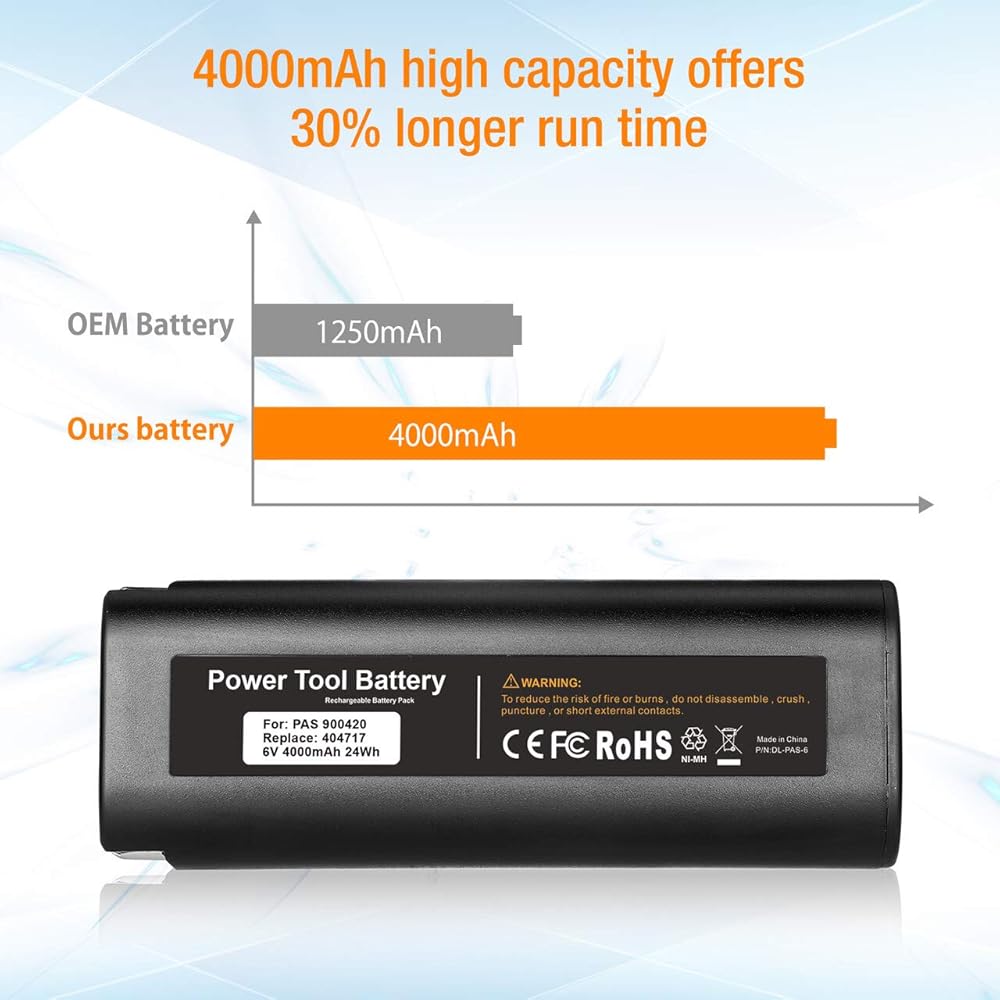 Quick charge with original 900200 charger and power adapter, professional replacement battery for 6v Paslode 404717, 405176, B20544E, BCPAS-404717, BCPAS-404717SH.