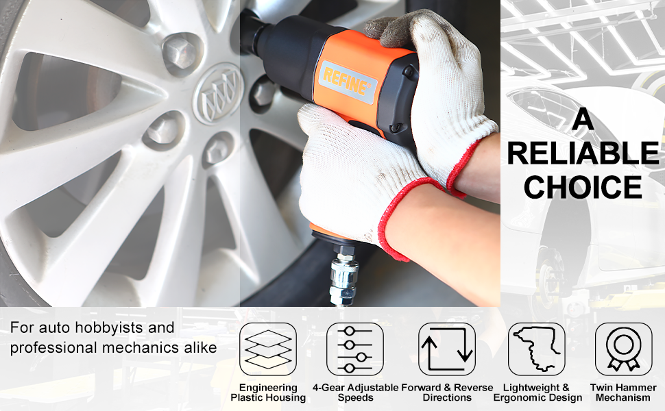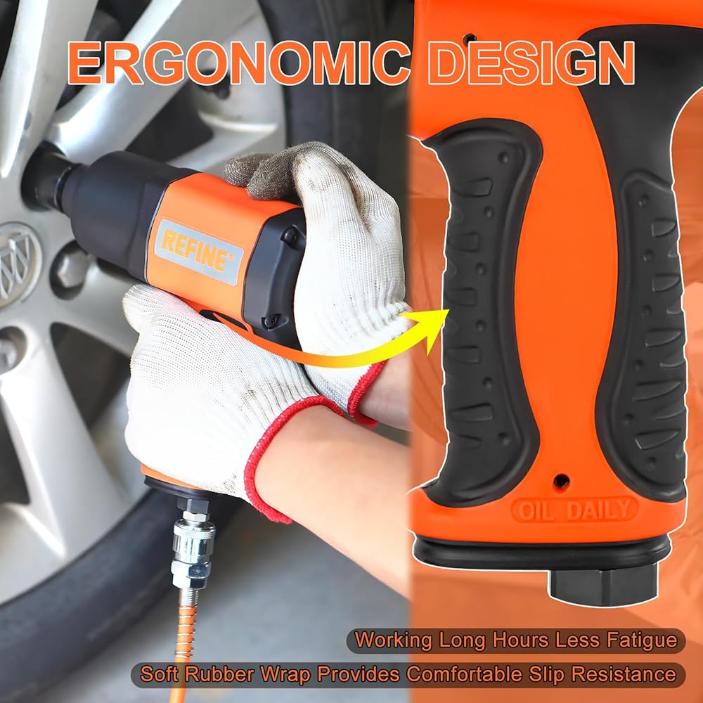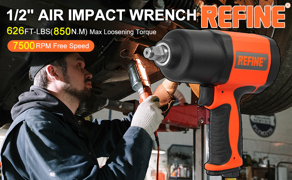 【POWERFUL & DURABLE】REFINE Air Impact wrench delivers 590 ft-lbs of max locking torque, 626 ft-lbs of max loosening torque and free speed of 7500RPM. The twin hammer mechanism helps ensure efficient performance, provides more power and smooth balanced blows. Engineering plastic housing and bearing steel square drive provide superior durability and long life.