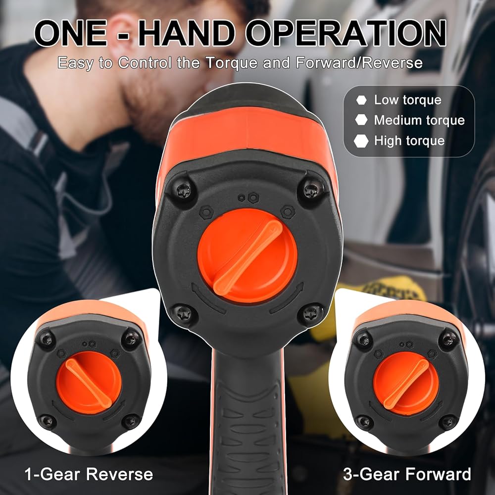 【4 ADJUSTABLE SPEEDS】This 1/2-inch impact wrench is equipped with a switch that combined 2 directions in 1, which has 3 forward speeds to tighten and 1 reverse speed to loosen, allowing you to switch directions and adjust torque output easily on different needs. It's a good choice to handle any automotive repair task and to save time and effort.