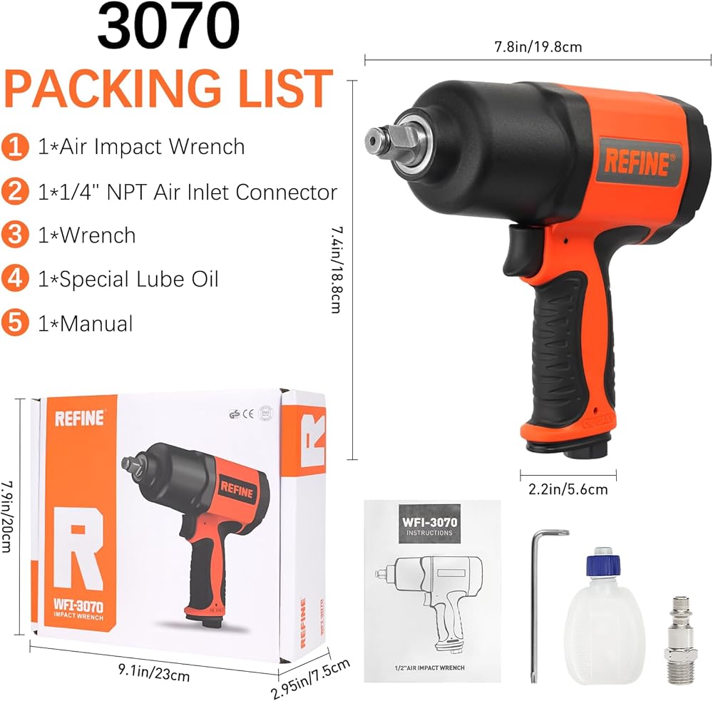 【PACKING LIST & TIPS】1*1/2" Air Impact Wrench, 1*Hex Wrench, 1*Special Lube Oil, 1*1/4"NPT Air Inlet Connector, 1*Manual; Tips: Recommended minimum capacity of air compressor: 100L/27GAL. Avg. Air Consumption: 5 CFM. Air pressure: 90 PSI.