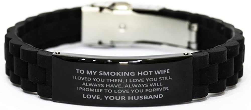 Meaningful black engraved stainless steel bracelet for To My Smoking Hot Wife. This is a special gift for To My Smoking Hot Wife, who can take it wherever they go. This lovely message-engraved bracelet is perfect for husbands, sons, or boyfriends. Durable and fashionable, this makes for the perfect fashion accessory.