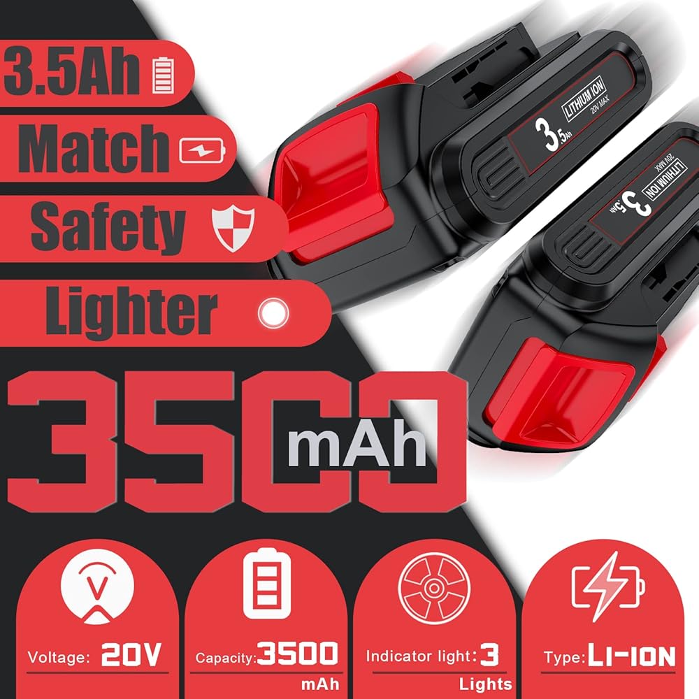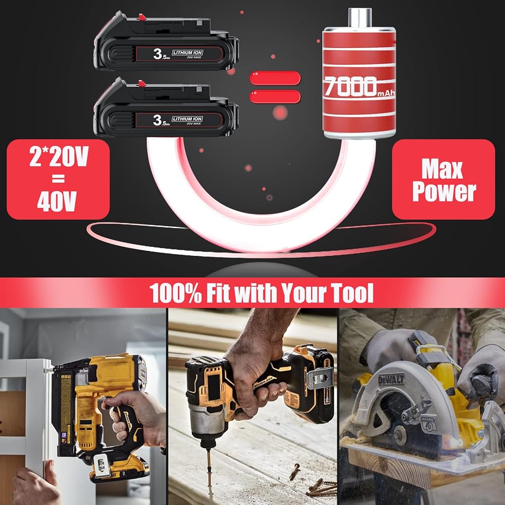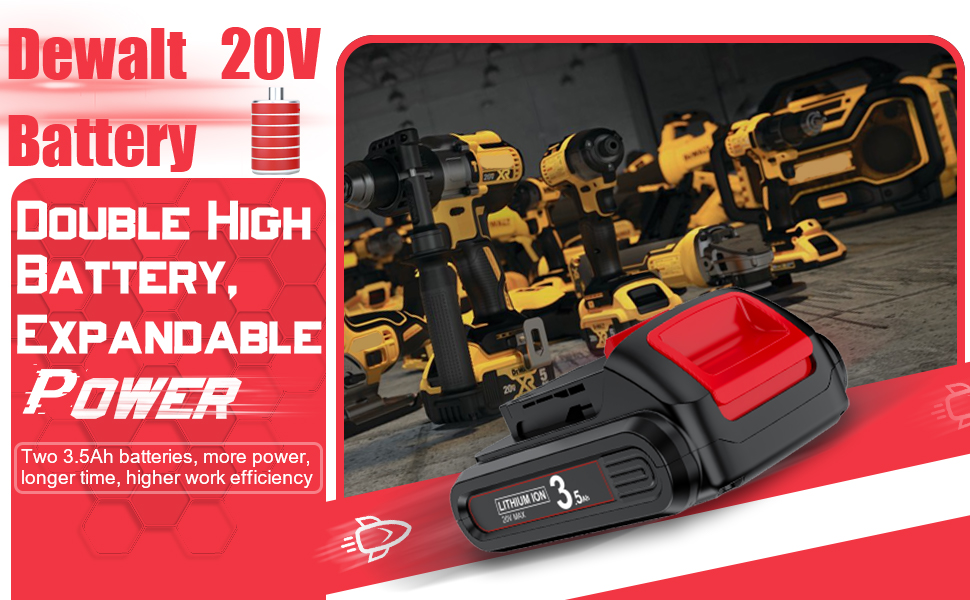 【3.5Ah Upgraded Capacity】3500mAh upgraded capacity 20Volt battery replacement for DEWALT, the use time is longer than your original battery, 2pack DCB200 batteries is more durable, so that your tool lasts longer, and it can also reduce the number of charging times, making the battery life longer