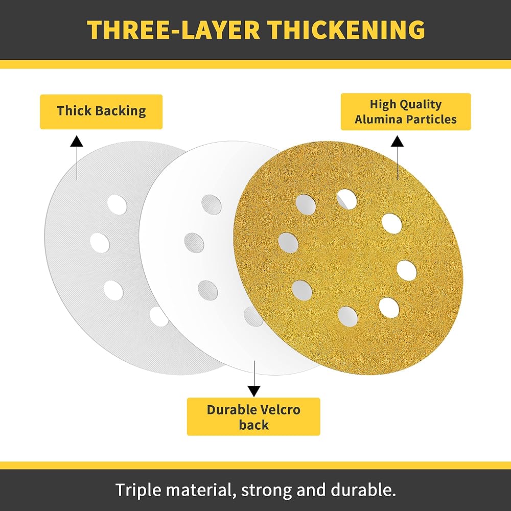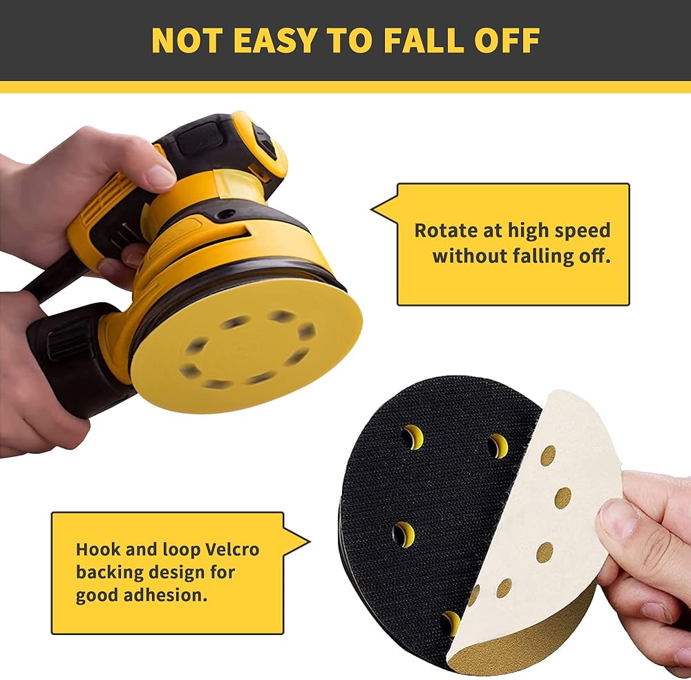 Our professional-grade 8-hole sandpaper delivers exceptional results, with a Velcro design that makes installation and removal faster and easier. These sandpaper discs are engineered to cut faster, last longer, and offer better abrasion resistance, while maintaining strong adhesion and not falling off when in use.