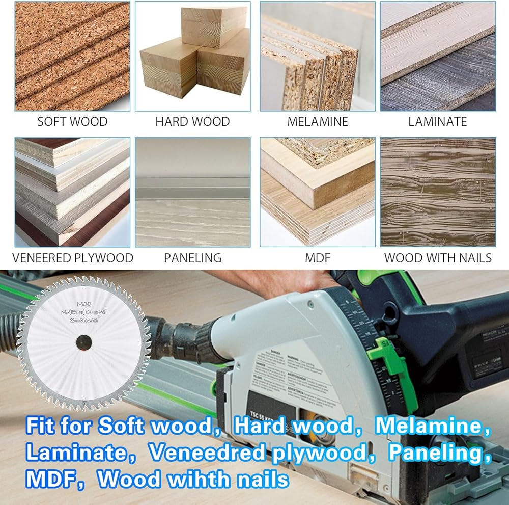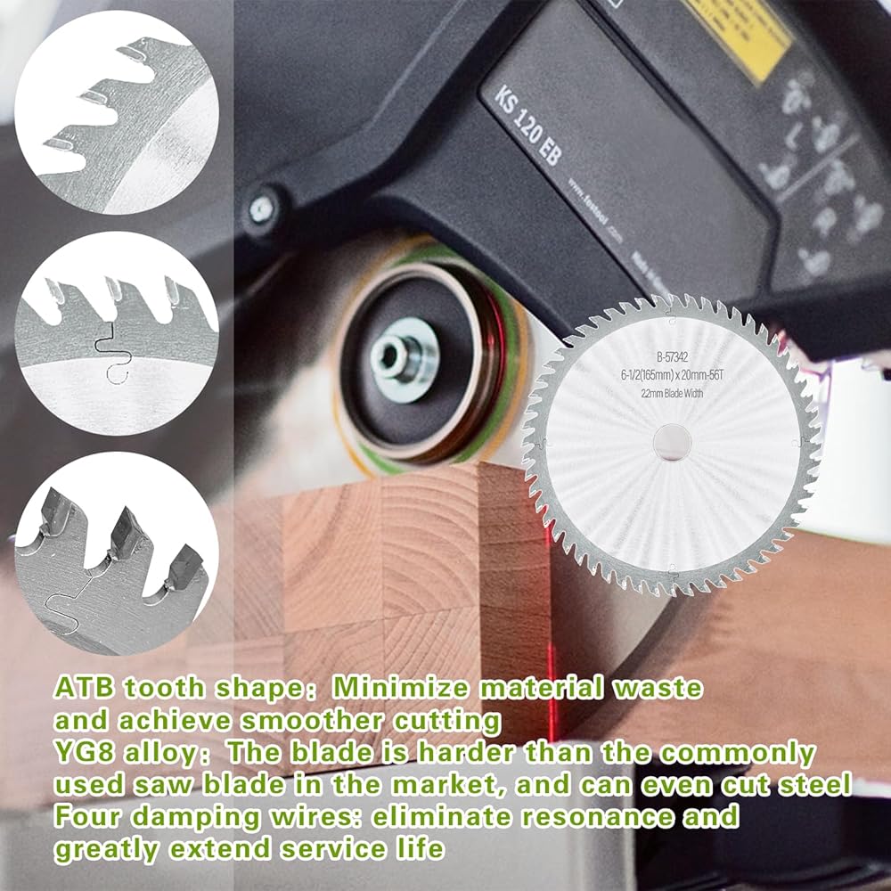 ✅【Specifications】① Diameter: 165mm ② Kerf: 2.2mm ③ Arbor20mm ④ Teeth: 56 Tooth ⑤ Tooth Shape: ATB ⑥ Blade degree: up and down 10 degrees, left and right 7 degrees, front and back 15 degrees ⑦ Blade material: YG8 hard alloy