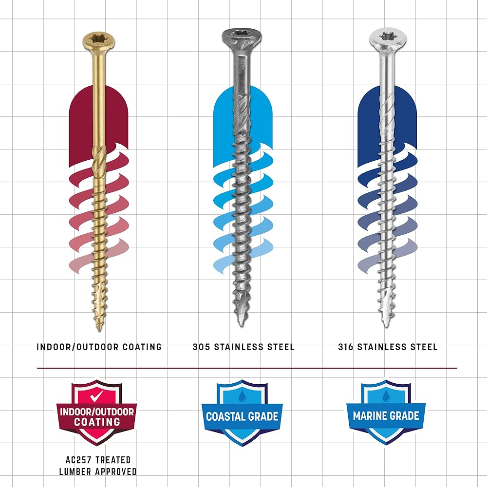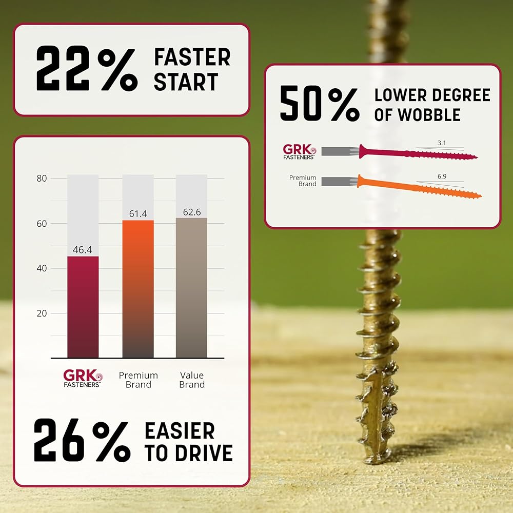 GRK R4 Multi-Purpose Screws are self-tapping with a countersinking head. They require no pre-drilling. This self-countersinking screw has a new underhead with saw-blade like cutting teeth and six self-contained cutting pockets. This transports the drill dust away from the edge of the screw hole while cutting a perfectly clean hole without cracking the surface. The screw head closes the hole off with precision, leaving no damaged fibers around the head. The R4 is available in 59 sizes and works well in wood, particle board, plastic, sheet metal, cement fiberboard, composite decking, wood decking, and melamine. Some sizes are available in PHEINOX Stainless Steel.