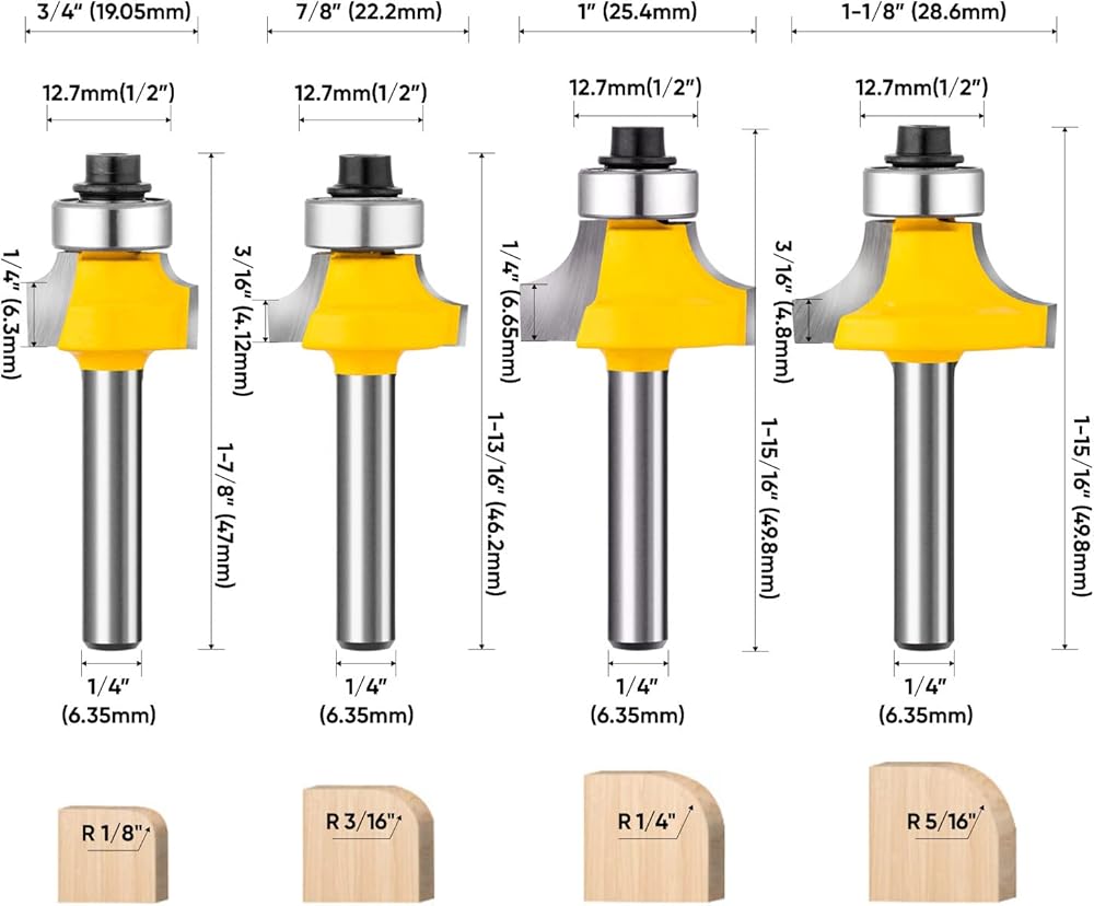 -[Ideal Combo Set] 4pcs round-over router bit set (R1/8”, 3/16”, 1/4”, 5/16”) . Come with a storage case.
