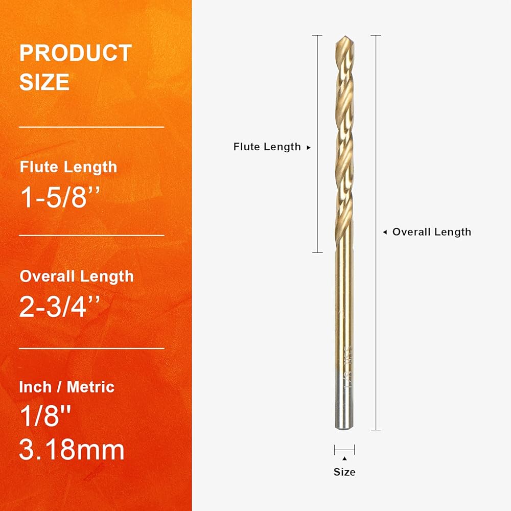 【10Pcs 1/8" TWIST DRILL BITS】10Pcs - 1/8”(Dia 3.18mm) x1-5/8”(Flute Length 41.28mm) Metal Drill Bits.This drill bit fits the majority of power drill currently on the market and come with a portable plastic case for easy storage and organization.
