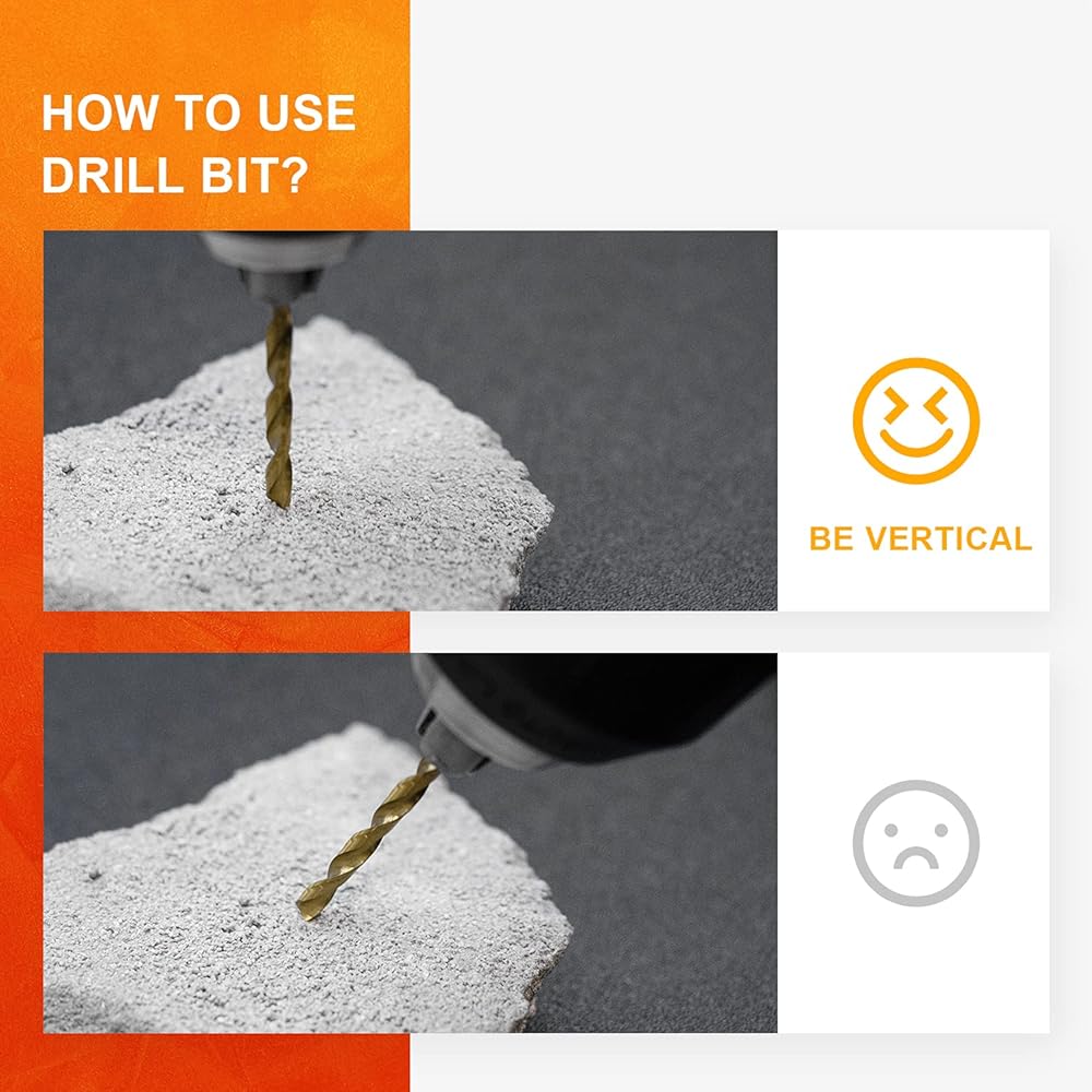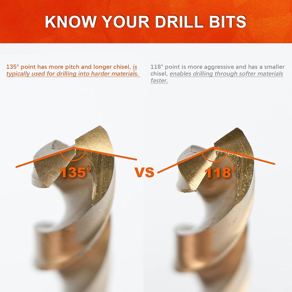 【135° SPLIT POINT & FULLY GROUND PROCESS】135° point has more pitch and longer chisel, is typically used for drilling into harder materials. No center punch is needed; Fully ground spiral groove design clears particles quickly, decreases friction and heat for a faster and cooler drilling performance.
