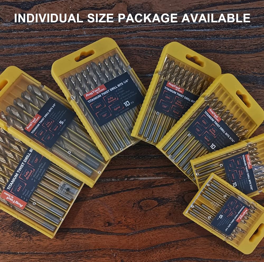 【PREMIUM HSS TITANIUM Coating】Industry grade 4341 high speed steel drill bit set, harder than 4241 HSS used in other similar drill bits set. Titanium coating increases wear-resistance and durability.