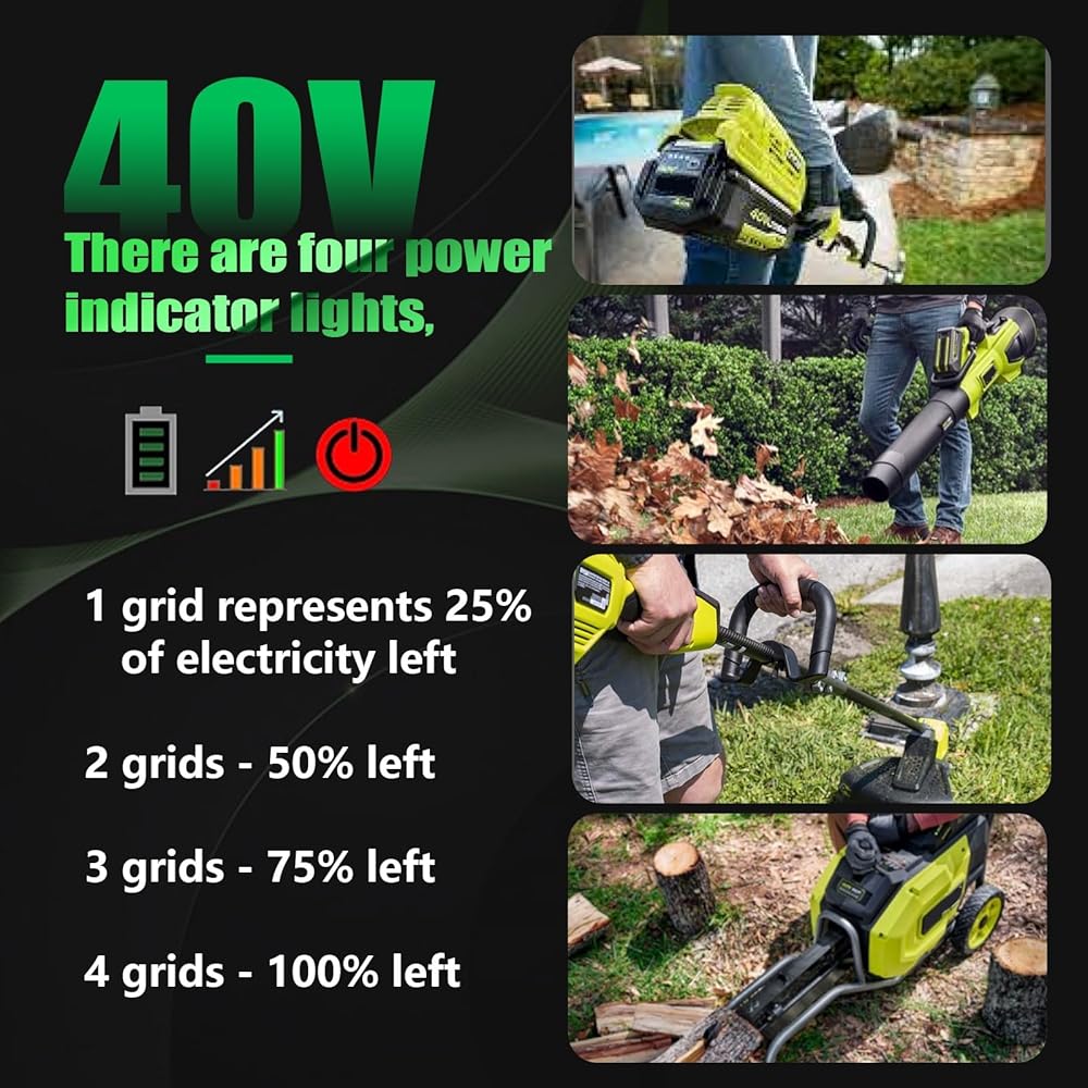 ✅【Great Replacement for Ryobi 40v battery】100% Brand New 40V | 6.0Ah | lithium-ion battery. The 40V replacement battery for Ryobi has high-capacity rechargeable battery for extended run time. Repeated tested to match over 10 Ryobi 40v power tools. Ryobi replacement batteries with four LED lights on the battery that display the remaining power and reduce the risk of downtime work, allowing you to monitor charge levels conveniently.